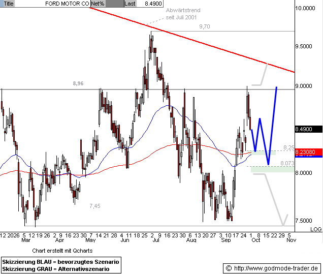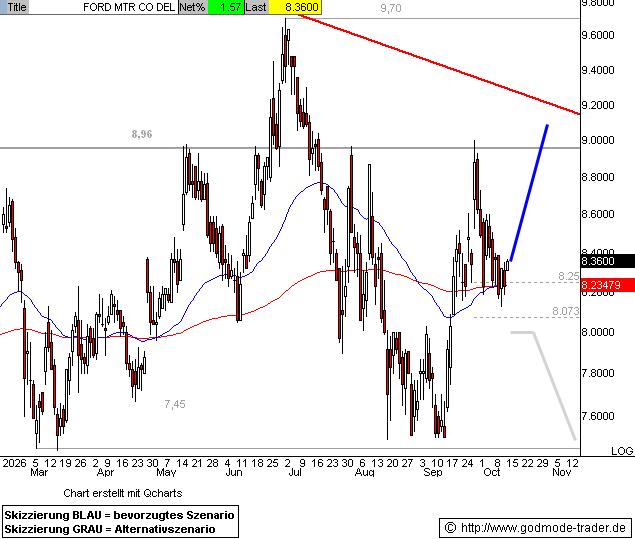 Kurz-Kommentierung: Die FORD Aktie erreichte nach einem deutlichen Kursanstieg im September die Oberkante der übergeordneten Seitwärtsrange bei 8,96 $ und prallte daran nach unten hin ab. Zwischenkorrektur erreichte dabei den Zielbereich bei 8,07 - 8,25 $, wo sie sich aktuell stabilisiert. Von hier aus könnte die Aktie nun direkt wieder ansteigen, das Ziel liegt bei ca. 9,00 - 9,25 und darüber 9,70 $ (mittelfristiger BUY Trigger). Ein Rückfall per Tages- und Wochenschluss unter 8,00 $ hingegen drohen nochmals Abgaben bis 7,45 - 7,50 $.