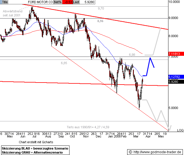Rückblick: Die FORD Aktie befindet sich in einer langfristigen Abwärtsbewegung. Dabei rutschte sie Anfang März unter die unter die markanten Tiefs der letzten Jahre gelegte Unterkante zurück, was einen deutlichen Abverkauf zur Folge hatte. Das mittelfristige Abwärtsziel der Tiefs aus 1990/91 bei 4,27 - 4,59 $ wurde aber nicht erreicht, die Aktie drehte nach einem neuen Mehrjahrestief bei 4,95 $ wieder nach oben.