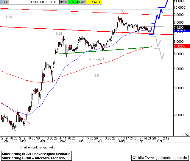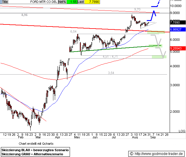Charttechnischer Ausblick: Die Ford Aktie hat gute Chancen auf eine Fortsetzung der Rallyebewegung. Geht es jetzt per Tagesschluss über 7,83 $, sollten weiter steigende Kurse bis 8,96 - 9,70 $ folgen. Oberhalb von 9,70 $ hellt sich das langfristige Chartbild weiter auf, mittelfristige Kursgewinne bis 17,34 $ wären dann möglich.