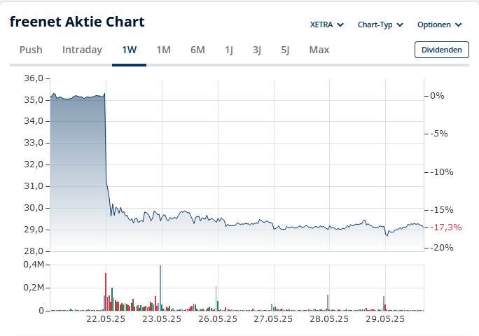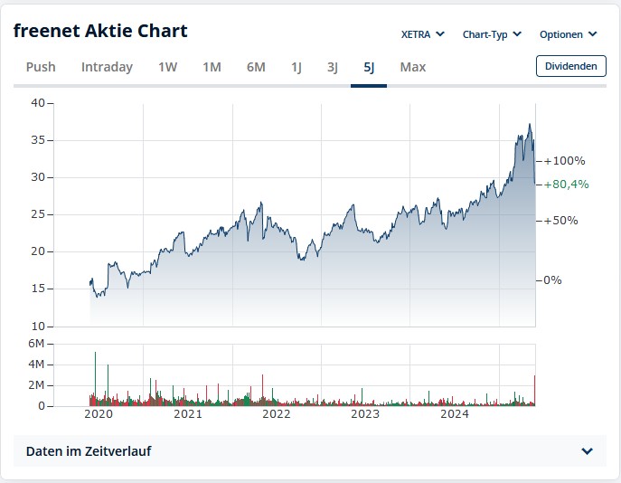 Nach dem (irrationalen) Kursrückgang von 17 % auf aktuell 28,84 € in dieser Woche ("Geier-Sturzflug") notiert die Aktie mit einem erwarteten KGV 2025e von rund 12x. Das durchschnittliche erwartete KGV in der europäischen Mobilfunkbranche liegt etwa bei 16x. Die Gesamtrendite für die freenet-Aktionäre betrug in den letzten drei Jahren 45 % und wird auf jetziger Kursbasis künftig nicht schlechter ausfallen.