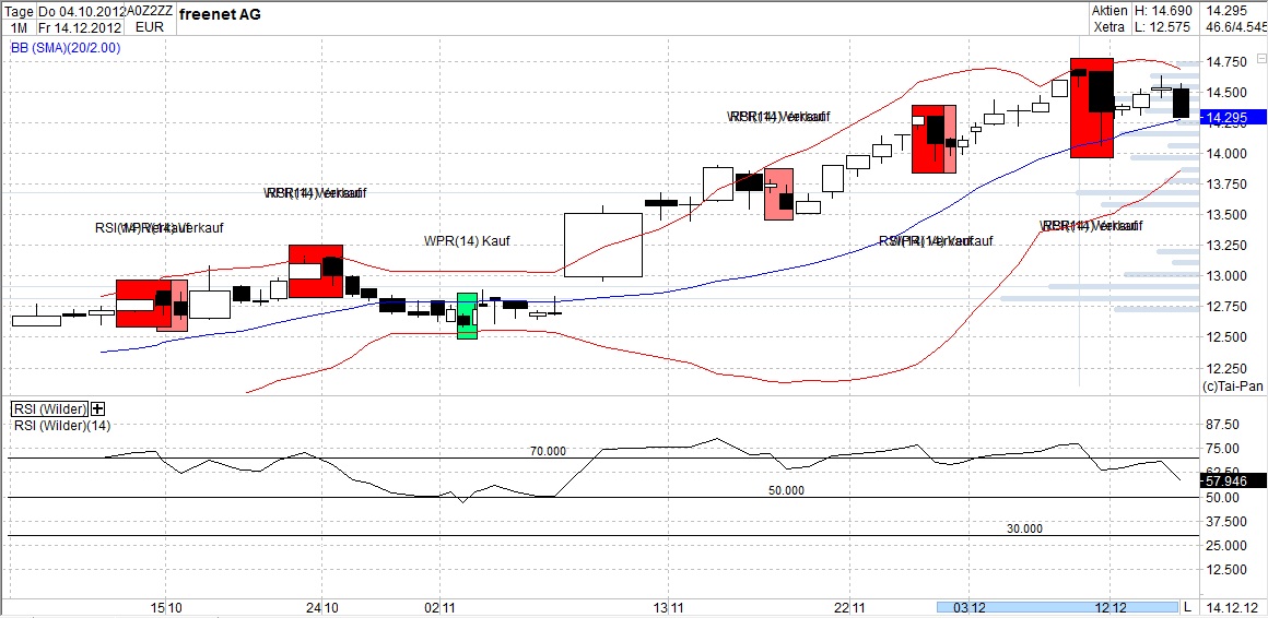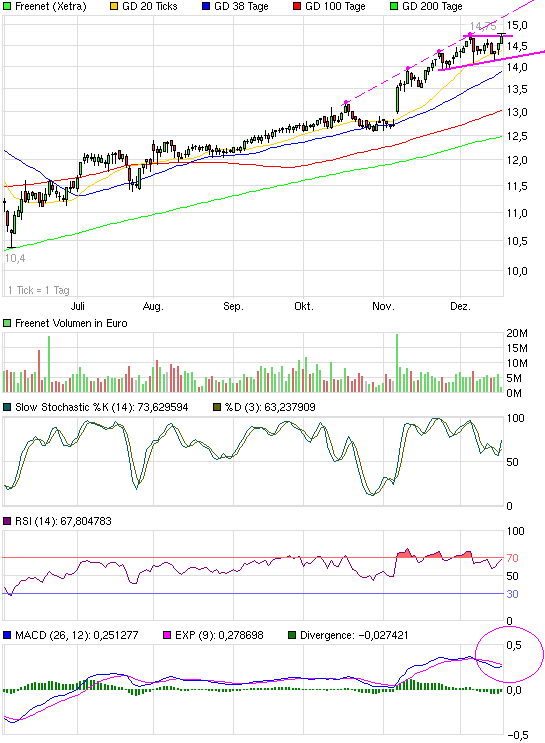 Der langfristig sinkende RSI verdonnert Freenet eigentlich zum  Absturz. Mal sehen was es auslöst. Ich tippe darauf, dass die Stop-Buys  über 15 abgefischt werden und es dann "Gute Nacht" heißt. Vorerst. Die  Parabel ist noch nicht am Wendepunkt. Sicher nicht  so kurz vor 15.