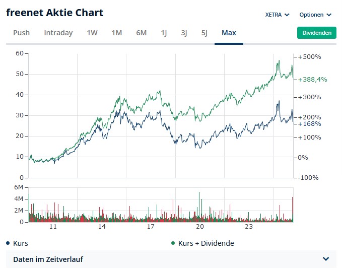 Da der DAX kein reiner Kursindex ist sondern ein "Performanceindex", beinhaltet der DAX (und sein Chart) auch die Dividenden der enthaltenen Unternehmen, fairerweise müßte man folglich den Freenet-Chart mit Dividende zum Vergleich heranziehen den kriege ich bei https://www.finanzen.net/aktien/freenet-aktie@stBoerse_XETRA aber nicht für beliebige Zeiträume rausgekitzelt.