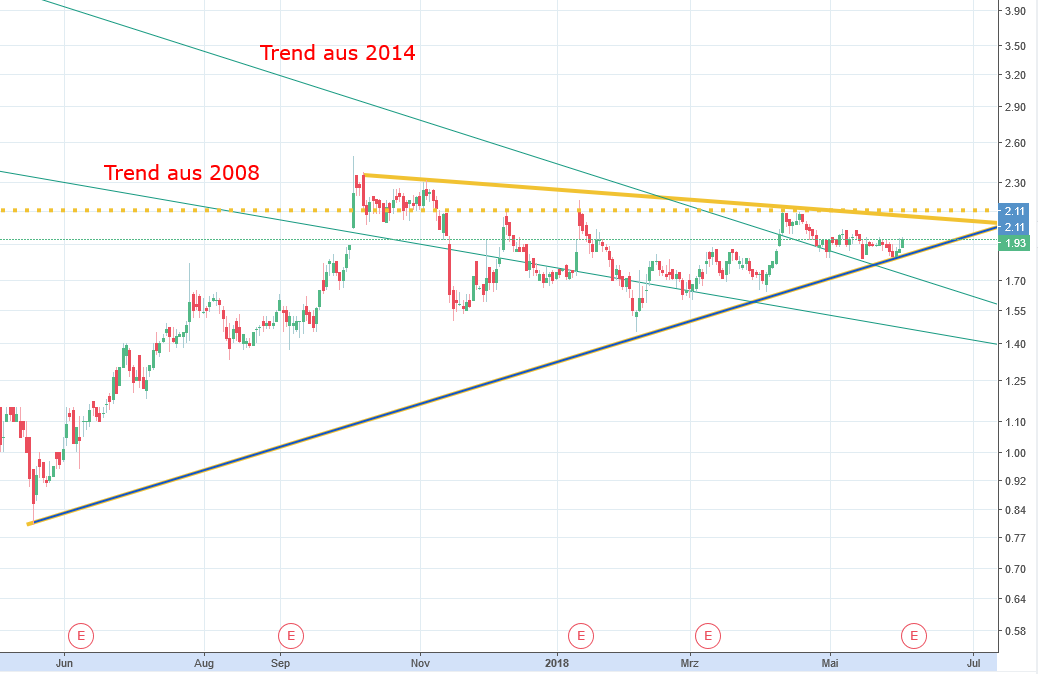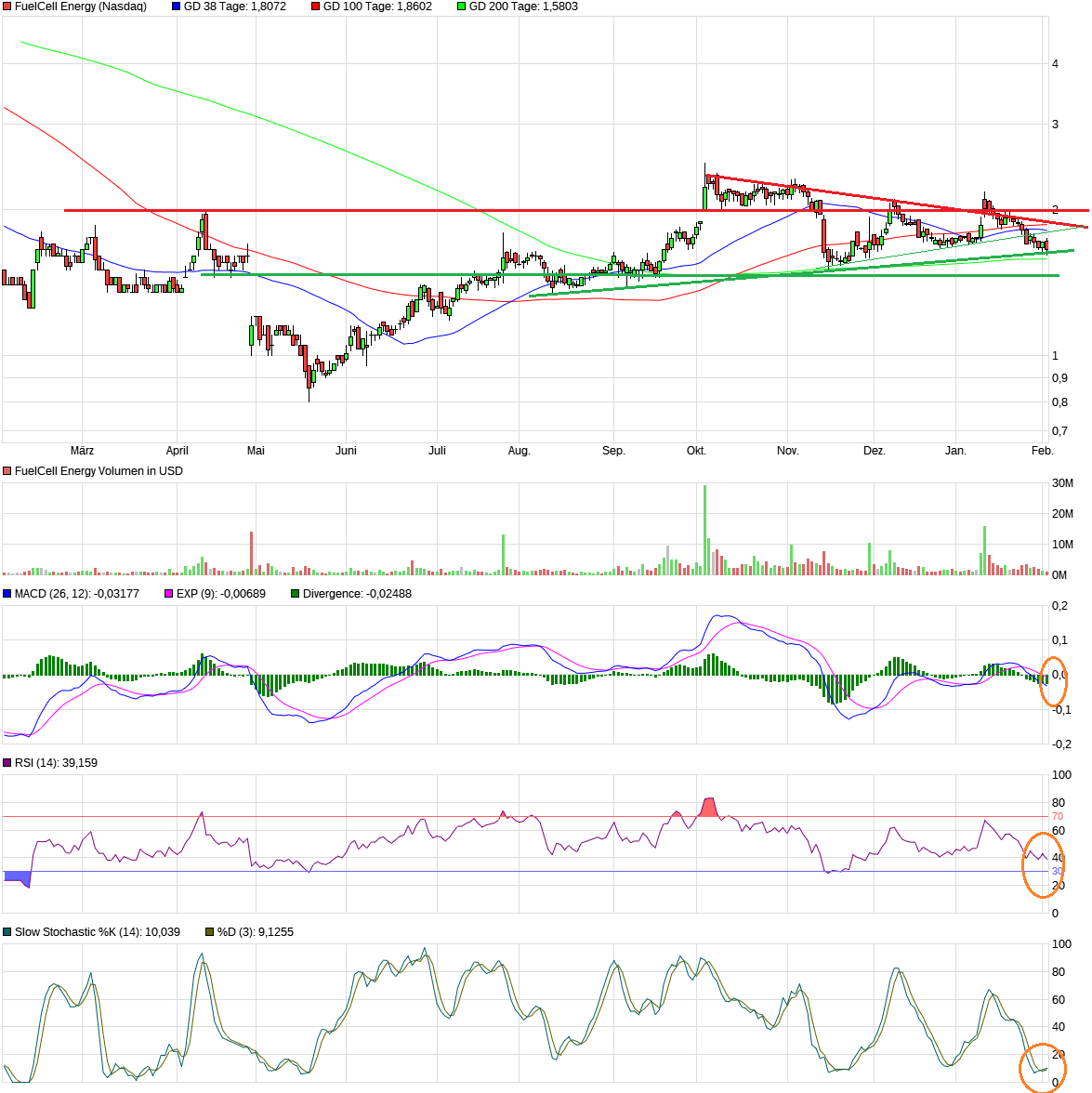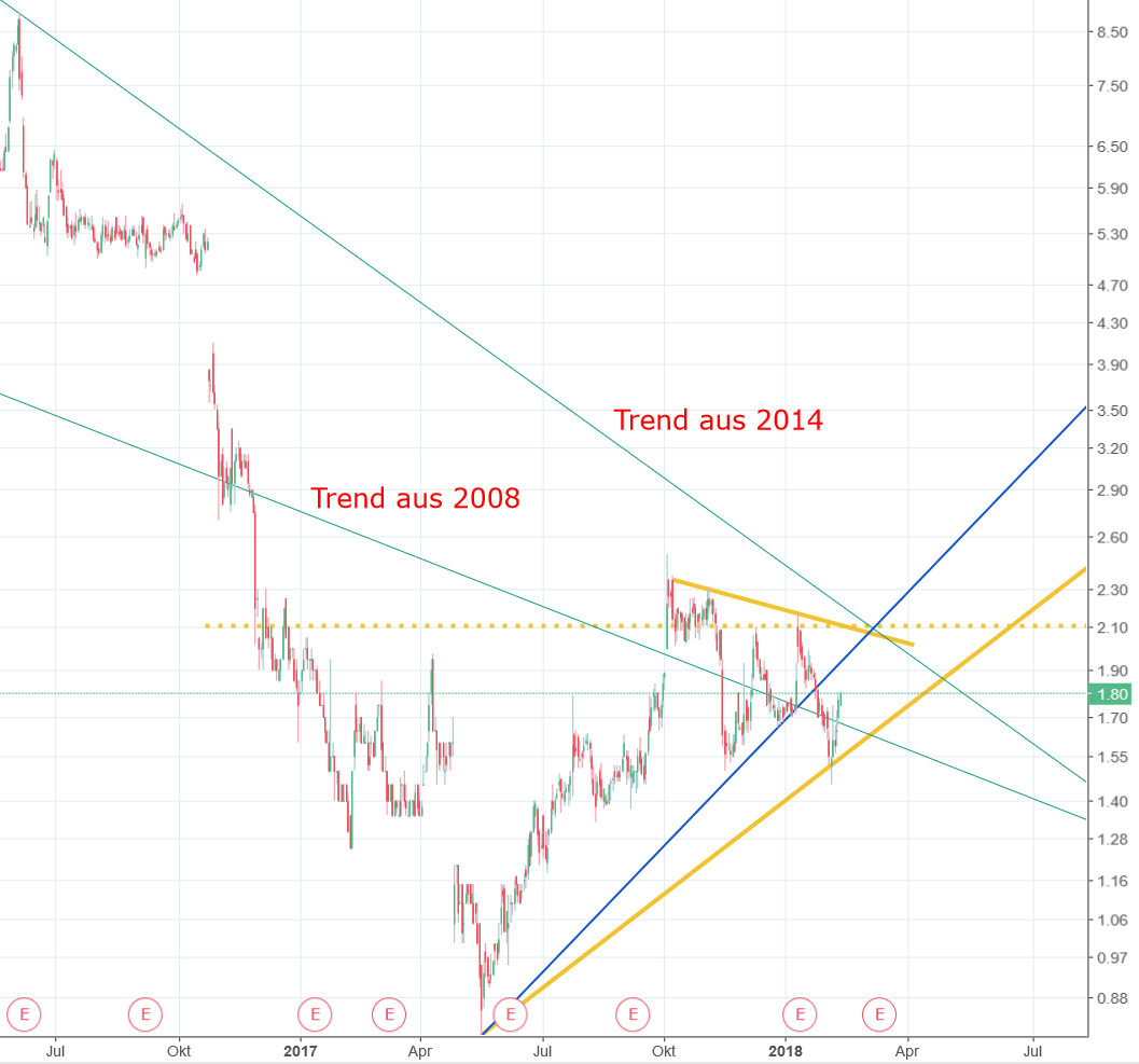 Anbei ein paar Linien im LOG-Chart, wie ich es aktuell sehe. Ich bin allerdings nicht wegen der CT hier investiert und habe zuletzt bei 1.52 USD hier nachgekauft (mein Gesamtminus bleibt hier extrem, zumindest noch). Zu diesem Zeitpunkt war das charttechnisch reines Niemandsland. Allerdings waren wir zuvor sauber an der blauen Linie nach oben gelaufen. Ganz relevant dürften könnte nach wie vor die 2,10 USD sein, da nach dem LOG Chart hier noch der Abwärtstrend aus 2014 verläuft. Allerdings gab es einen sehr beachtlichen Meilenstein durch die Gleichberechtigung mit den sonstigen alternativen Energieformen. Hätte es das bereits vor 2 Jahren gegeben, wäre FCEL nicht ggü. Wind/Solar benachteiligt worden und ggfs. einiges öfters zum Zuge gekommen. Jetzt sind diese Karten neu fair gemischt, FCEL allerdings zwischenzeitlich massiv abgestürzt. Ich denke/hoffe ich, dass der Kurs den neuen Fakten folgt und sich dies dann in der CT wiederspiegelt. Ab 2,10 USD würde ich anfangen aufzuatmen. Man vergibt vermutlich bis zum Erkennen eindeutiger Zeichen an die 20%. Anders wäre es ja auch zu einfach. Der Sektor ist natürlich auch zu beachten. Unabhängig von den Markthängern der letzten 2 Wochen, hat Ballard durch die Shortattacke (Fakenews in Reinform) die BZ-Werte nach unten gezogen, die schlechten Zahlen von PLUG taten ihr übriges. Aber auch das geht vorbei. Den Chart gerne zur Diskussion, will schließlich was lernen. |