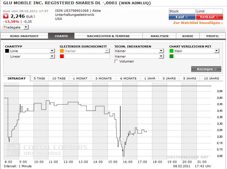 Keine Ahnung, wie dein SL war, aber Tradegate stellte einen Tiefstkurs von ca. 2,16 € um 8:20 Uhr. Ich habe gestern ein Abstauberlimit bei 2,20 gesetzt und einen Zuschlag bekommen. Habe heute nachmittag bei 2,45 wieder verkauft. Ich rechne mit weiter fallenden Kursen in den nächsten Tagen. Mal sehen, wo es sich stabilisiert. Heute hält die 3-$-Marke. Wie schon gesagt: Der Kurs steht in keinem Verhältnis zum Umsatz. 2011 wird man wohl weiter Verluste schreiben, auch wenn man diese weiter reduzieren will. Ob Facebook hilft, sehen wir dann. Ich warte die Kursentwicklung der nächsten Tage ab.