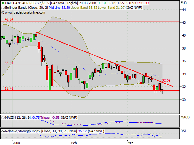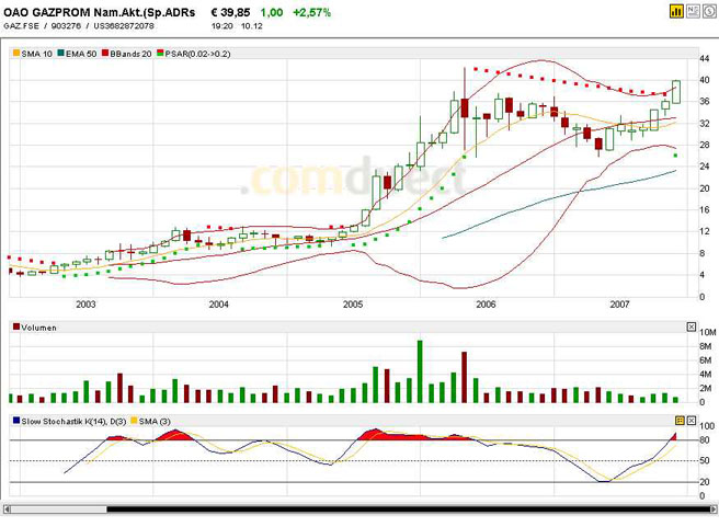 Die Russen, die bei Gazprom wirklich was zu sagen haben, sind an so kurzfristigem Zeug wie dem Hochhalten von Aktienkursen garantiert nicht interessiert. Putin und Co denken in langfristiger und vor allem "realer" Macht. Insofern ist gerade die Gazprom-Aktie wohl eine der unterbewertesten der Welt. Die haben mehr Energiereserven als Exxon oder Petrochina, die deutlich höher bewertet sind. Und Gazprom hat auch keine Eile, diese Reserven vorschnell leerzuräumen, außer zum selbst diktierten Preis. Andere Konzerne müssen fürchten, dass sich die politischen Rahmenbedingungen verschlechtern (höhere Fördergebühren...) und sie vielleicht sogar aus einem Land rausgeekelt werden, Gazprom hingegen "besitzt" praktischerweise den Staat mit den größten Erdgasreserven. Die verlangten Preise werden auch für die GUS-Nachbarländer und innerhalb Russlands zur Zeit schrittweise angehoben, die Gewinnmargen also recht verläßlich erhöht (mit Unterstützung des Westens, der sich gegen Wettbewerbsverzerrungen duch niedrigere Energiepreise innerhalb Russlands ausspricht).