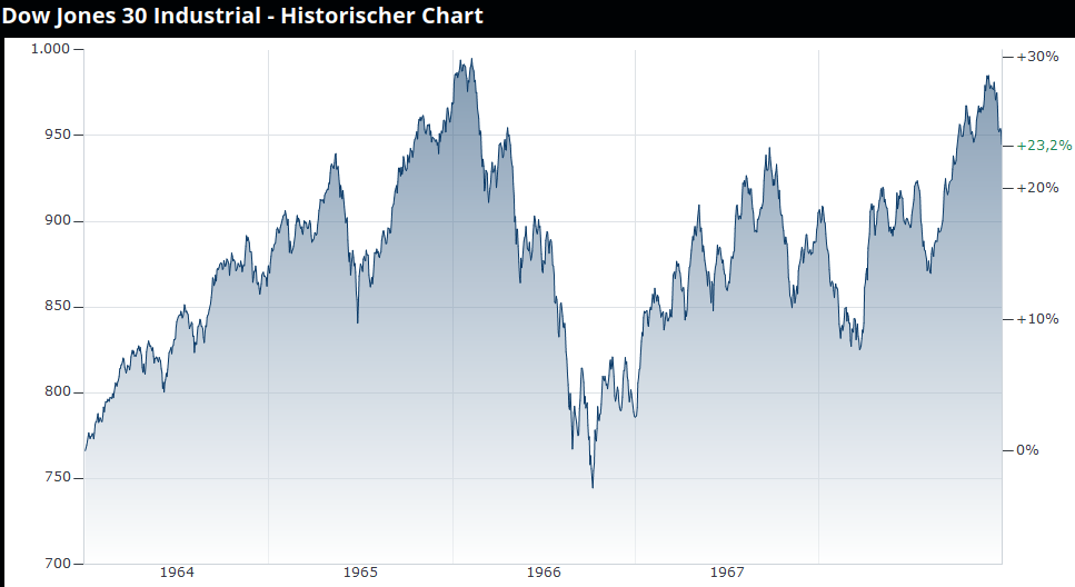 Hier der Verlauf des DowJones in den Anfangsjahren des Vietnamkrieges, danach ging es 20 Jahre lang seitwärts