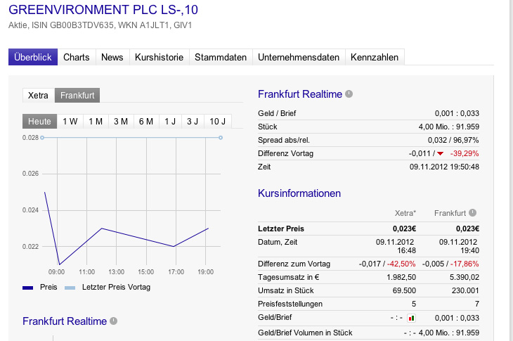 Greenvironment Public Limited Company (PLC) … die letzte HV fand in London statt … die Aktie wird in Deutschland an 5 Börsenplätzen gehandelt: wovon 3 (Xetra, Xetra2 = Frankfurt, Tradegate) von der Deutsche Börse AG betrieben werden ... an denen wird GIV am 15.12. delistet werden … nach der "Elfer-Recherche" werden sich dann sozusagen automatisch die 2 anderen dem anschließen und auch delisten …