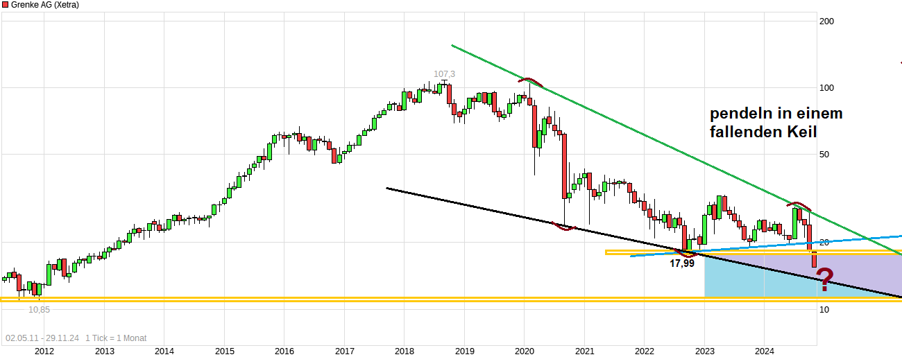 Durch den Break der Region um 18€, wo eine wichtige größere horizontale Unterstützung lag, ist hier erst einmal viel CT Porzellan zerschlagen worden. Muß jetzt nicht gleich weitergehen bis in den Bereich um 11€ ( außer es käme nochmal eine weitere größere Gewinnwarnung.), aber ein weiteres absinken bis zu Unterseite ( = schwarze Linie) des fallenden Keil ist aus meiner Sicht hier noch gut vorstellbar. Das würde wohl erst eine klare nachhaltige Rückkehr über die 18er Marke wieder neutralisieren. Von daher lasse ich hier die Finger erst einmal weiter von dem Wert solange die Signal-Lage hier keine klaren Umkehrsignale wieder liefert und auch die weiteren politischen Verhältnisse in Deutschland unklar sind. Und ganz verwundern würde es mich auch nicht, wenn in den ersten Monaten des Jahres 2025 prognosemäßig doch nochmal nachjustiert würde nach unten, da die letzte Unternehmensmitteilung schon so klang als würde die Eintrübung bei Ausfällen/Insos erstmal noch ein Weile erstmal weiter anwachsen.