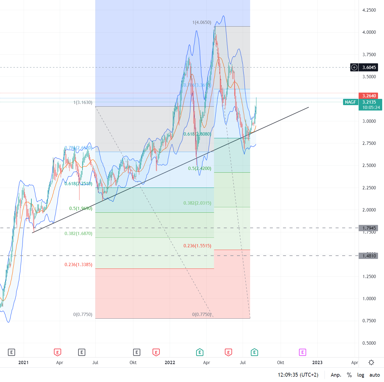 Die blaue Linie ist der Zweijahresdurchschnitt und die graue der Trend durch die aufsteigenden Tiefs. Soweit liegen die nicht mehr auseinander.