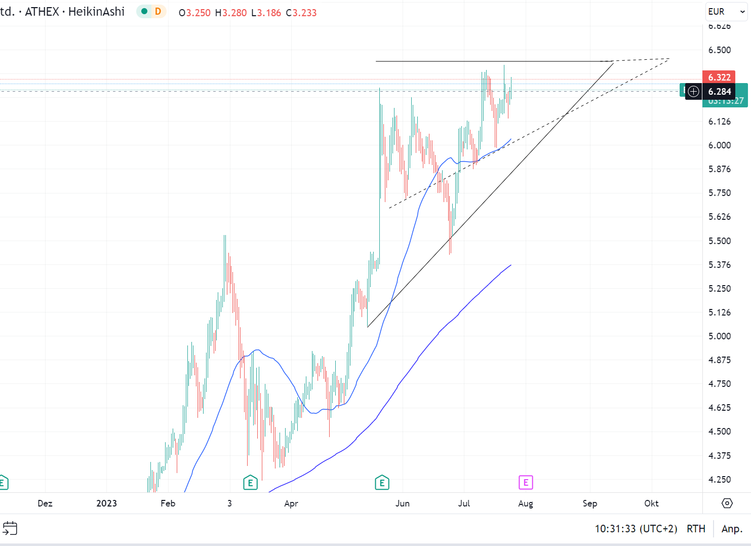 Denselben kurstechnischen Move hast Du bei der Airline (übrigens genauso wie bei südamerikanischen), nur mit dem Unterschied, dass ich der griechischen Airline mehr Substanz und Übertreibung zurechne als anderen Luftfahrtwerten, und ich denke, dass Mythilineos am Beginn eines Bullenzyklus steht und daher mehr Raum für beides bieten sollte als bspw. Aegean mit nahezu deckungsgleichen Chartmoves der letzten Vergangenheit.