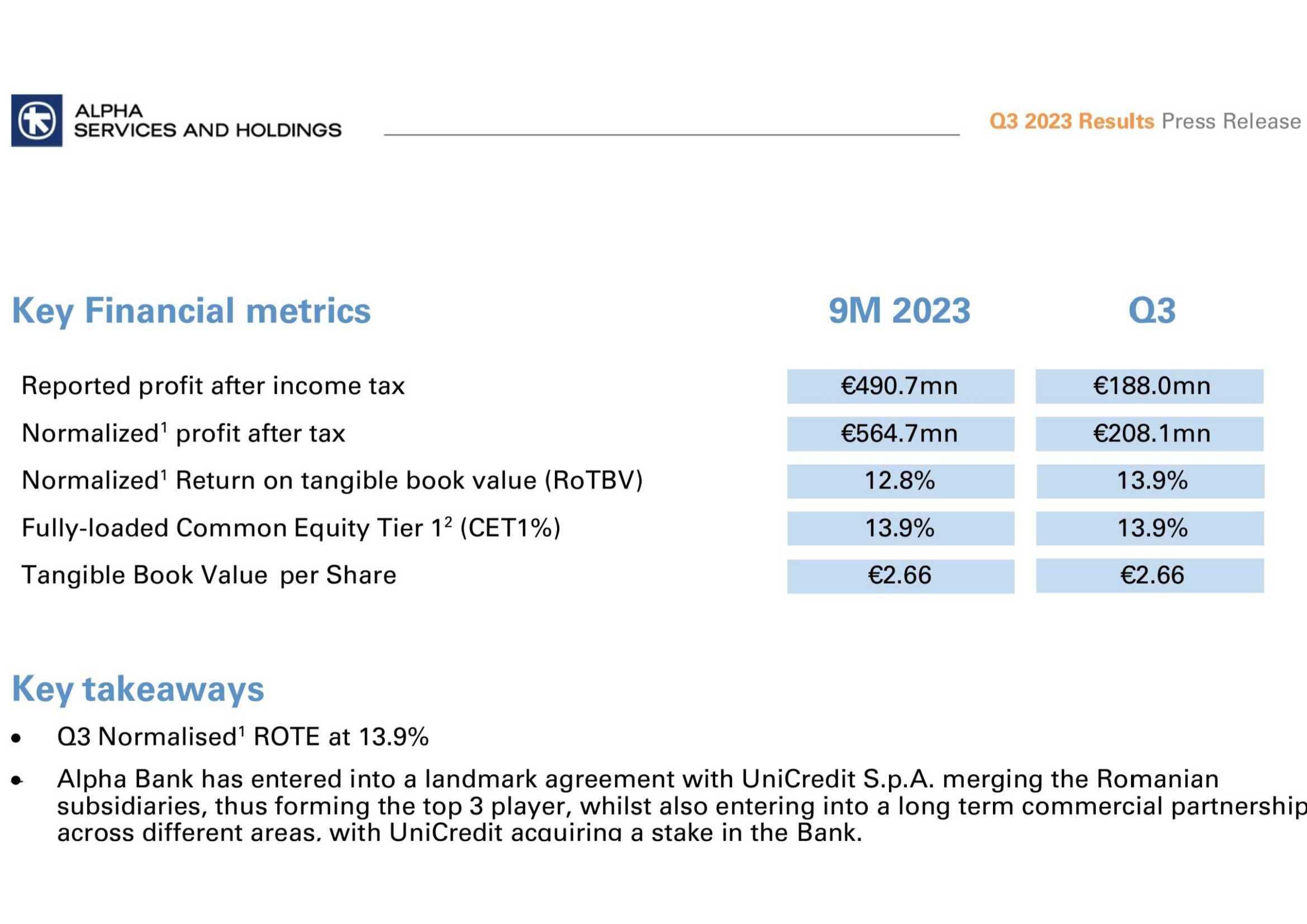 • Q3 Normalised1 ROTE at 13.9% 9M 2023 €490.7mn Q3 €188.0mn €564.7mn €208.1mn 12.8% 13.9% 13.9% 13.9% €2.66 €2.66 • Alpha Bank has entered into a landmark agreement with UniCredit S.p.A. merging the Romanian subsidiaries, thus forming the top 3 player, whilst also entering into a long term commercial partnership across different areas, with UniCredit acquiring a stake in the Bank.