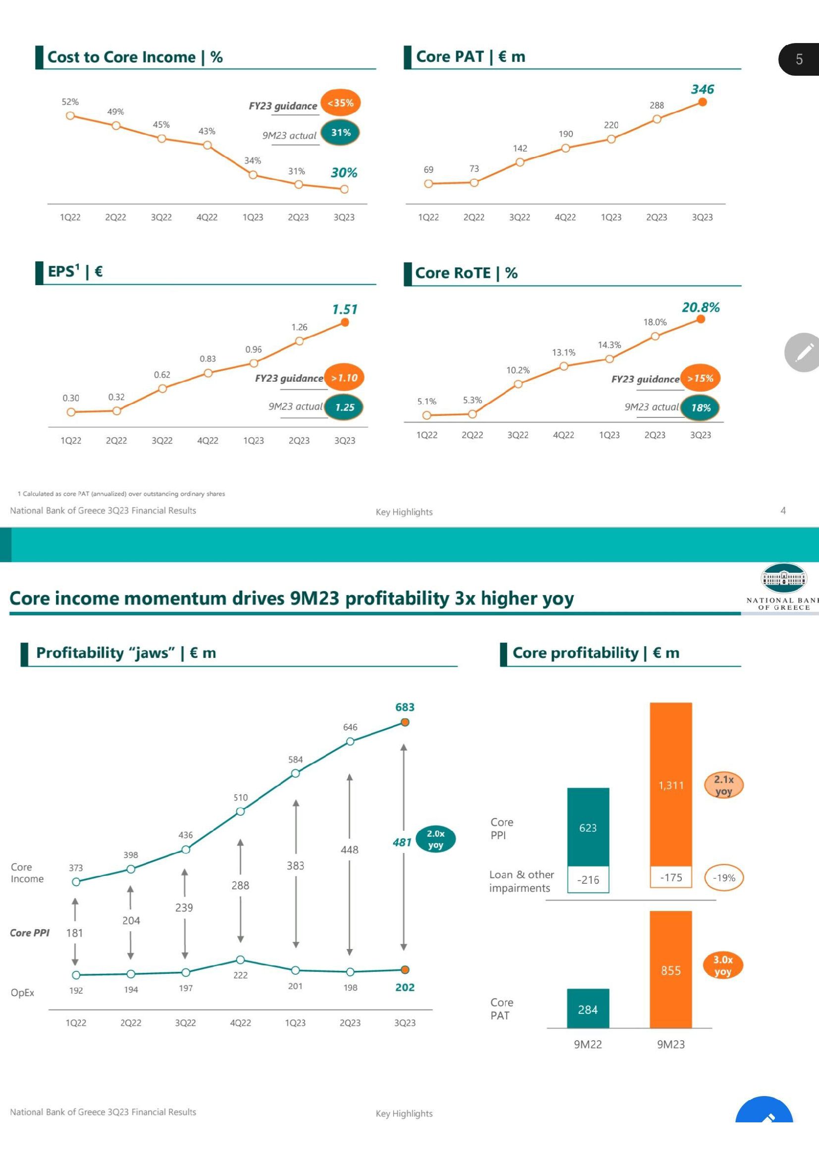 • Recurring OPEX 1.5% better q/q to €235.5mn on reduced G&As. 9M 2023 recurring OPEX flat3, despite inflationary pressures and investments, tracking in line with 2023 guidance. C/I down by 14pp vs 9M 2022. • Core PPI up by +18.4% q/q, on higher top line and improved fee performance. 9M 2023 Core PPI up +74.2%, driven by strong Core Banking Income increase (+34.4% y/y).