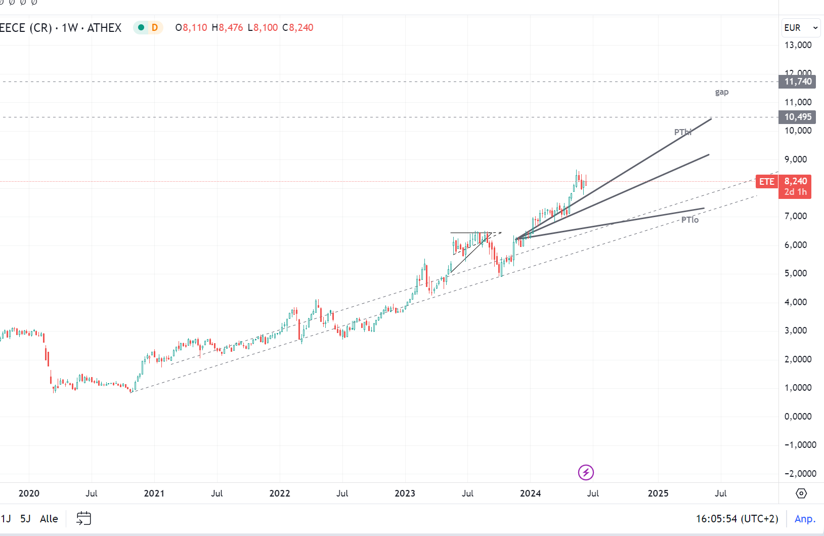Interessant auch der Ausblick auf die nächsten Jahre. Der CEO Mylonas geht von einem stabilen wirtschaftlichen Markt in Griechenland aus und von einem starken Anstieg der Nachfrage nach Krediten sowohl im Unternehmens- als auch im privaten Bereich. Zugleich meint man, die NBG werde so modernisiert und attraktiv, dass sie die Bank für alle Griechen werden könnte. Da denke ich, dass hier ein wenig viel Stolz und Pathos zum Ausdruck gebracht wird. Jedenfalls scheint man - wie auch die anderen großen Banken - von steigenden Gewinnen auch bei fallenden Zinsen überzeugt zu sein. Was das Jahr 2024 betrifft, wird man das sicherlich unterschreiben können, da das halbe Jahr bereits vorüber ist, und abgesehen von dem einen ersten Zinsschritt der EZB, noch nicht viel auf dieser Seite passiert ist. Der mögliche nächste Zinsschritt im Spätherbst, kommt zu einem Zeitpunkt wo das Gesamjahresergebnis 2024 der Banken nicht mehr sehr stark beeinflusst wird. Das wird erst 2025 interessant.