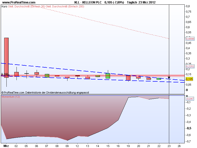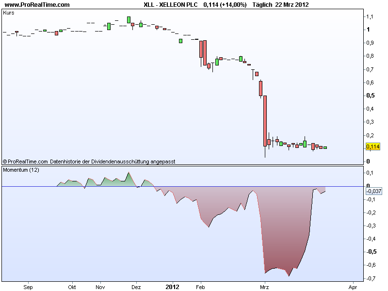 Laut RSI ist Xelleon immer noch unterbewertet. MACD wird immer positiver, was auf ein sich verstärkenden Trend hinweist, trotzdem ist der MACD in der Unterbewerteten Zone. Der Momentum-Index steht kurz vor einem Kaufsignal, wenn der Kurs morgen über 14 Cent gehen sollte.