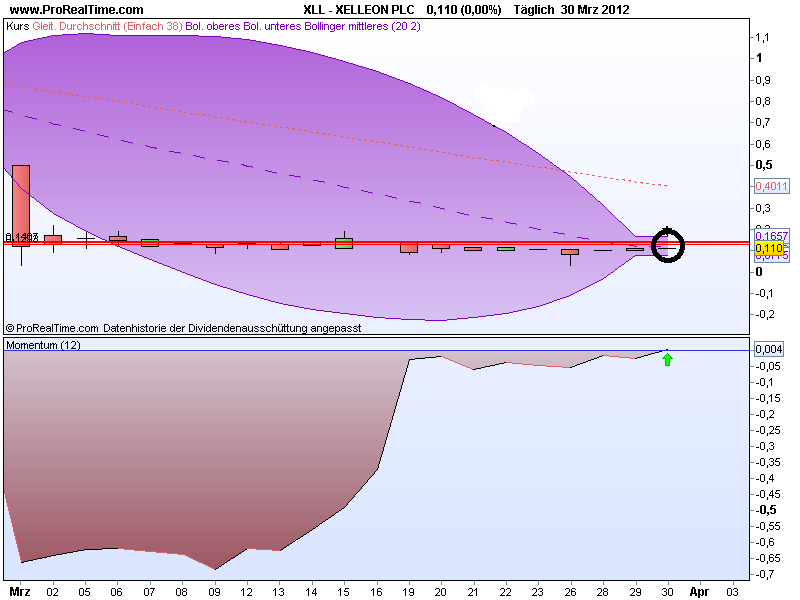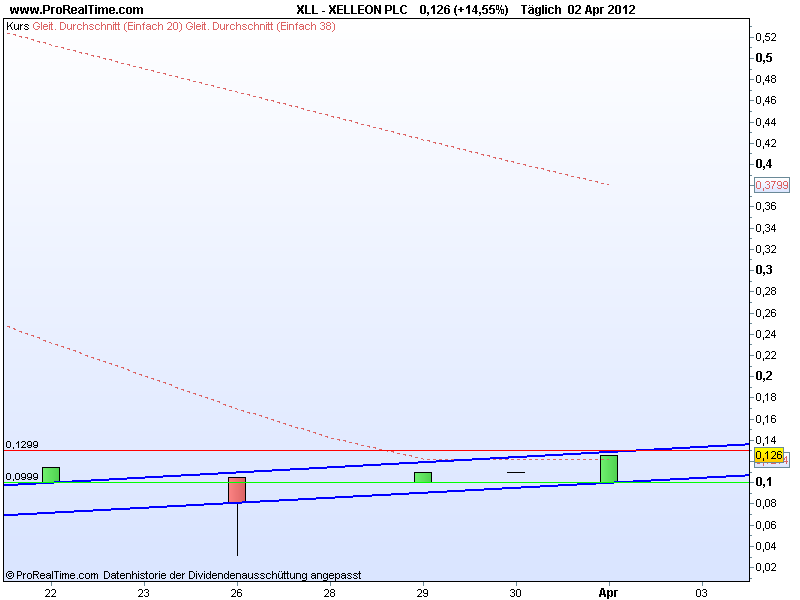 Heute ist der Kurs bis auf 0,126 € gestiegen. Also noch 0,4 cent bis zum 0,13 € Wiederstand (rote linie). Inzwischen bewegen wir uns in einem leichten Aufwärtstrend (blaue Linien). Dabei werden wir von den 0,1€ unterstützt. Tiefer sollte der Kurs nicht fallen. Außerdem haben wir heute den Gleitenden Durchschnitt 20 nach oben gekreuzt- Kaufsignal. Morgen sollte es zum Showdown an der 13 Cent Marke kommen. Wird sie gebrochen ist nach oben Luft. (Die 14 Cent Marke konnte ich nicht wieder finden hat sie sich aufgelöst?) Übrigens: Der Einkaufsmanagerindex hat zugelegt, das bedeutet mehr Konsum, also mehr Verkaufte Artikel von Firmen, mit denen Xelleon Geschäfte macht. Morgen entscheidet es sich, also drann bleiben. |