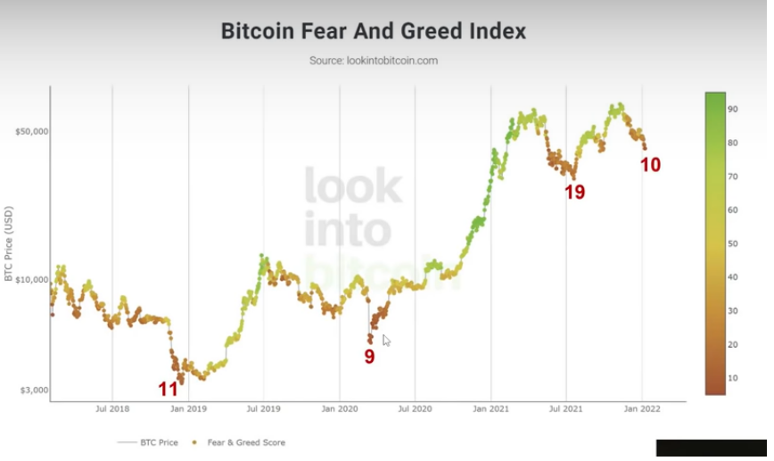 vom Bitcoin- Fear and Greed Index mit dem aktuellen Wert von "10"