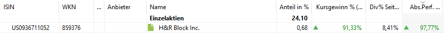 Doch mein Kursziel ist längst nicht nur erreicht, sondern auch mit Allzeithochs überschritten. Ich wollte Kursgewinne realisieren, um Cash zu generieren. H&R Block war von den aktuellen Marktkorrekturen noch nicht erfaßt worden und so ist mir das nun wie gewünscht gelungen.