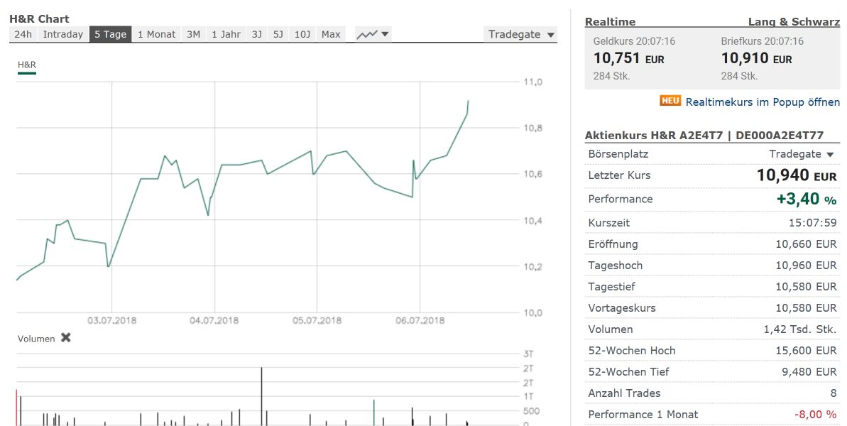 Der Kurs der Aktie H&R stand am 03.08.2018 zum Schluss an der heimatlichen Börse Xetra bei 9,75 EUR. Der Titel wird der Branche "Spezialchemikalien" zugerechnet.