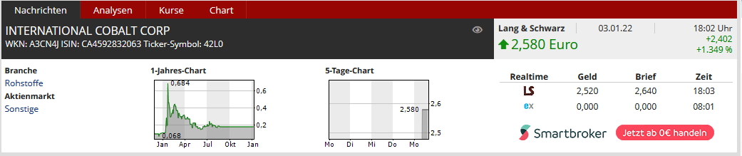International Cobalt Corp. meldet Ergebnis für das erste Quartal zum 31. Dezember 2021