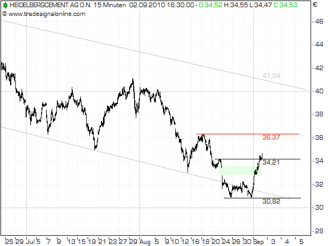 Also erwarten kann ich vorläufig nur das, was mir der Chart anzeigt. Insofern sind die Zick-Zack-Kurven nicht willkürlich gewählt, sondern orientieren sich (wie du sagst) an den bestehnden Trends. Wenn natürlich ein Trend früher oder später gebrochen wird als von mir erwartet, müsste ich natürlich auch die Prognosekurven entsprechend anpassen. Charttechnik heißt ja nur, Signale zu handeln. Die aktuellen Signale lassen eine kurze Gegenbewegung nach oben erwarten, kann allerdings auch noch diese Woche auf 29,x € abwärts gehen, bevor die Gegenbewegung startet. Die Gegenbewegung kann je nach zeitlicher Ausdehnung bis 35,x € gehen, aber wahrscheinlicher ist eher rund 34 €. Trendbestätigend müsste es dann aber wieder wesentlich weiter abwärts gehen. Wenn der Trend gebrochen wird, muss man neu schauen. Bislang ist der Trend aber ziemlich stark, und durch zwei weitere Widerstände an der Oberkante zusätzlich gesichert. Über 36,5 € zu kommen, dürfte zumindest bis Ende November sehr schwer bzw. höchst unwahrscheinlich sein. Da geht es eher bis 26,x € abwärts. Dort wäre eine antizyklischer Longeinstieg spekulativ am aussichtsreichsten. ----------- "Aber jeder erbärmliche Tropf, der nichts in der Welt hat, worauf er stolz sein könnte, ergreift das letzte Mittel, auf die Nation, der er gerade angehört, stolz zu sein."