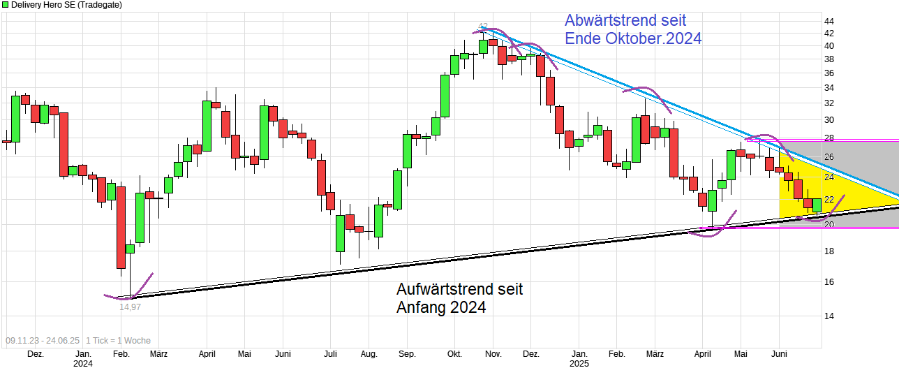 am 10.06.25 hatte ich in Posting #2709 geschrieben "... es bleibt jetzt zu hoffen man bleibt über der Aufw.trendlinie die seit Anfang 2024 steigt und z.Z. bei ca. 20,70 verläuft.." Aktuell sieht man den Versuch einer Gegenreaktion nachdem man an dieser seit Anfang 2024 steigenden Aufw.trendlinie angekommen ist bzw. die 20,67€ erreicht hatte. Man ist damit inzwischen auch ca. 50% von dem Okt. 24 - Top zurückgekommen und pendelt vielleicht jetzt wieder in Richtung der seit Ende Oktober 2024 fallenden Abw.trendlinie, die z.Z. bei ca. 25€ verläuft. Irgendwann muß es zudem auch mal eine Entscheidung geben wie man aus dem sich zuspitzenden Dreieck aus diesen beiden Trendlinien wieder raus will. Daher habe ich jetzt mal eine spekulative Position eröffnet und sichere die ab, falls man diese steigende Trendlinie doch noch unterschreiten sollte.