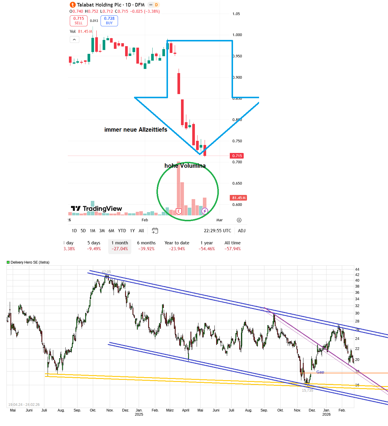 Heute also dann die Meldung über enttäuschende Zahlen bei Talabat. Das hat den Talabat Kurs dann wieder unter den Unterstützungsbereich bei ca. 0,91/ 0,92 getrieben und man nähert sich nun wieder dem alten Allzeittief. Damit ist die Erholung des Talabat Kurses zu großen Teilen wieder weg. Natürlich verliert man durch die absolut trostlose Kursentwicklung von der Tochter Talabat Milliarden an Substanz bei Delivery Hero. Da müßten eigentlich bei einem Impairment Test auch mal irgendwann Wertberichtigungen vorgenommen werden bei DH. Wenn also das einst wertvolle Tafelsilber sich mehr und mehr wieder in Blech verwandelt, dann geht der DH Aktienkurs eben auch weiter nach Süden zurück. Ist die Frage wie nachhaltig sich diese Talabat Schwäche jetzt weiter in 2026 durchzieht. Denn das eigentliche operative Geschäft von DH ist ja nicht besonders sexy bzw. dürfte kaum sonderliche Gewinnsprünge machen. Und bislang hat man ja nur 20% an Talabat abgegeben. Es war ja angedacht später weitere Anteile zu verkaufen. Nun hatte man bei deutlich höheren Talabat Kursen aber gesagt, daß man bei diesen tiefen Kursen nicht verkaufen würde. Jetzt geht es seitdem aber immer tiefer. Wird Talabat damit für DH mit dem Argument quasi unverkäuflich, wenn man nicht wieder deutlich kursmäßig anzieht?