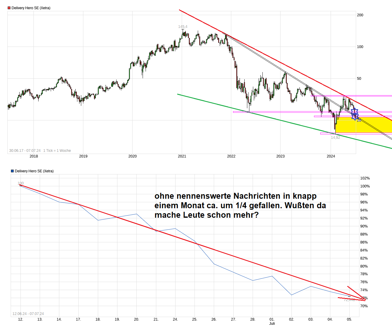 Hier kann es um über 700 Millionen gehen (400 Mio+x durch die EU plus zusätzlich 300 Mio durch die Spanier) die Delivery Hero zu zahlen hat an Strafe. Das würde zwar die Aktie nicht in den Konkurs treiben, aber es würden dadurch wesentliche Mittel fehlen, die für wichtige andere Dinge/Investionen/Schuldenabau, etc. nötig würden in Zukunft.