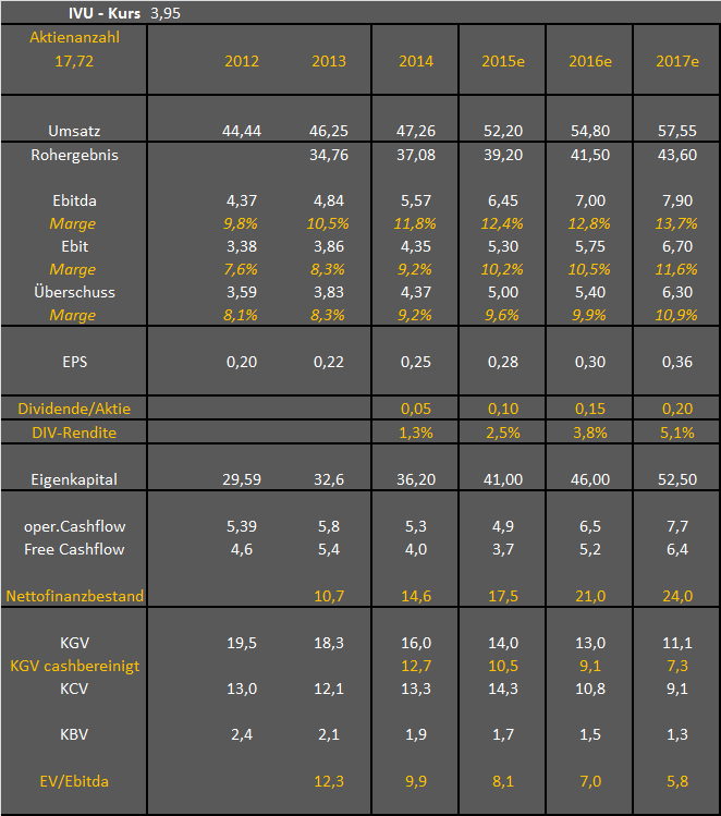 Zweitens hab ich beim FreeCashflow und Cashbestand keinerlei Schwankungen im working capital einbezogen, sondern nur die aktuelle Kostenstruktur in der GUV und danach den operativen Cashflow berechnet. Inwiefern IVU dann vorfinanziert und die Einnahmen erst später bekommt, kann ich natürlich heute nicht absehen. Beim Nettofinanzbestand habe ich entsprechend die Dividenden abgezogen, was den Unterschied vom Freecashflow zum geringer steigenden Finanzbestand erklärt. Dass die Dividende stärker steigt als der Überschuss lässt sich leicht mit der Bilanz erklären. Hängt aber wie immer natürlich vom AG Abschluss ab. Ich gehe aber davon aus, dass man nicht jedes Jahr so einen geringen AG Gewinn hat wie 2014. Insofern können die Dividenden auch mal ein Jahr gering und dafür im nächsten umso höher sein.
