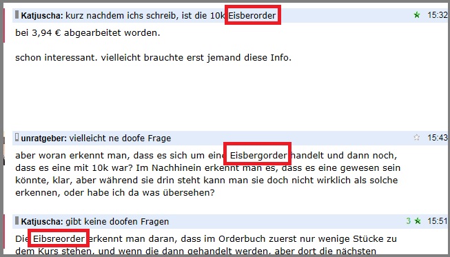 Sind aber meist etwas liquidere Marktteilnehmer, vielleicht sogar institutionelle Anleger, die solche Möglichkeiten haben, das bei ihrem Broker auszuhandeln. Oder hat von euch jemand die Möglichkeit, Eisberorders zu platzieren?