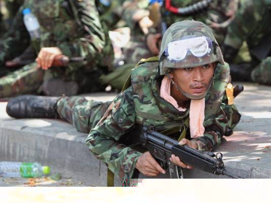Die Regierung betonte, dass die Sicherheitskräfte nur die Stellung halten und Blutvergießen verhindern wollten und keine Räumung des Geländes an der Ratchaprasong-Straße planten. Die Rothemden stellten sich dennoch auf einen Ansturm ein. In dem Areal sind nach Schätzungen der Polizei bis zu 5000 Menschen. Sie haben Steine und selbst gemachte Benzinbomben gehortet, um anrückende Einheiten abzuwehren. Die Demonstranten sprachen von 15 000 Besetzern.