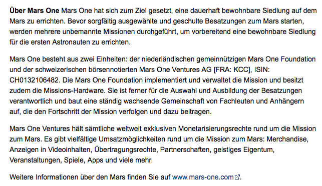Es wurde eine ordentliche Kapitalerhöhung um Fr. 95'777'500.00 unter folgenden Bedingungen beschlossen: a) Erhöhungsbetrag: CHF 95'777'500.00 b) Darauf zu leistende Einlagen: 100% c) Anzahl, Nennwert und Art der neuen Aktien: 478'887'500 Inhaberaktien zu CHF 0.20 d) Vorrechte einzelner Kategorien: keine e) Ausgabebetrag: CHF 0.20 f) Beginn der Dividendenberechtigung: ab Eintragung in das Handelsregister g) Art der Einlagen: durch Sacheinlage von 47'300 Aktien der Mars One Ventures PLC von Herrn Bas Lansdorp im Wert von CHF 95'777'500.00, für 478'887'500 Inhaberaktien zu CHF 0.20 h) Bezugsrechte: Die Bezugsrechte der bisherigen Aktionäre werden zugunsten der Sacheinleger aufgehoben.