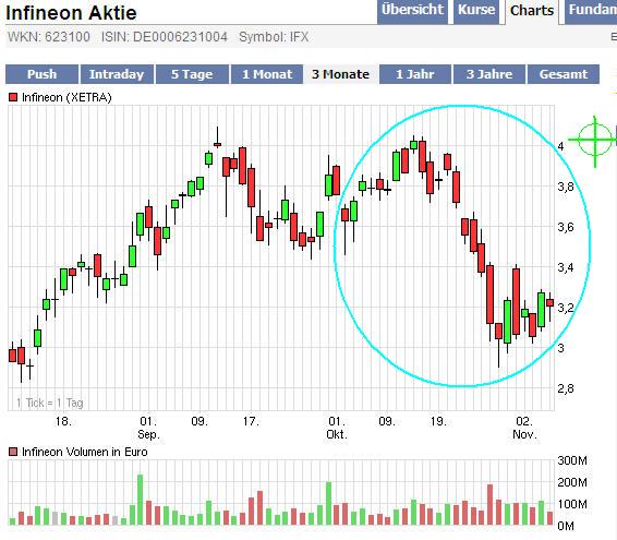 Leon Müller Während der Gesamtmarkt sich am Donnerstag freundlich präsentierte, konnte die Infineon-Aktie keinen Boden gut machen. Im Gegenteil. Der DAX-Titel büßte fast zwei Prozent an Wert ein, schloss unterhalb des Widerstands bei 3,25 Euro. Droht kurz vor Wochenschluss die nächste Abwärtswelle?Einen Tag vor Wochenschluss präsentierten sich die Börsen rund um den Globus von ihrer freundlichen Seite. Der DAX schloss am Donnerstag 2,3 Prozent über dem Intraday-Tief, der Dow Jones eroberte die Marke von 10.000 Punkten zurück. Infineon-Aktionäre hingegen hatten nichts zu jubeln. Als einer von nur neun Verlierern im Auswahlindex DAX büßte die Aktie des Münchener Halbleiterkonzerns rund zwei Prozent an Wert ein, war damit zweitschwächster Titel. Das gibt zu denken. Droht jetzt die nächste Abwärtswelle? Nachrichtenlage wird ignoriert Noch am Mittwoch trieben Gerüchte, der südkoreanische Konzern LG Electronics sei an einer Übernahme von Infineon interessiert, den Titel in die Höhe. Am Donnerstag wollte davon offenbar niemand mehr etwas wissen. Auch davon nicht, dass Infineon die Entwicklungs- und Produktionspartnerschaft mit dem Auftragsfertiger TSMC ausbauen wird. Die Zusammenarbeit beider Konzern begann von mehr als zehn Jahren. Kurzum: Die positive Nachrichtenlage wird wie schon in den vergangenen Wochen ignoriert, als Apple, Intel & Co mit ihren Zahlen hätten für Auftrieb sorgen sollen. Widerstand macht Erholung vorerst zunichte Nach oben hin scheint das Potenzial derzeit unter charttechnischen Gesichtspunkten im Bereich von 3,25 Euro begrenzt. Dort verläuft ein bisher schwacher horizontaler Widerstand, der allerdings mit jedem Mal stärker wird, sobald die Aktie an ihm scheitert. Zum horizontalen Widerstand gesellen sich die 100-Tage-Linie und knapp darüber die 90-Tage-Linie.