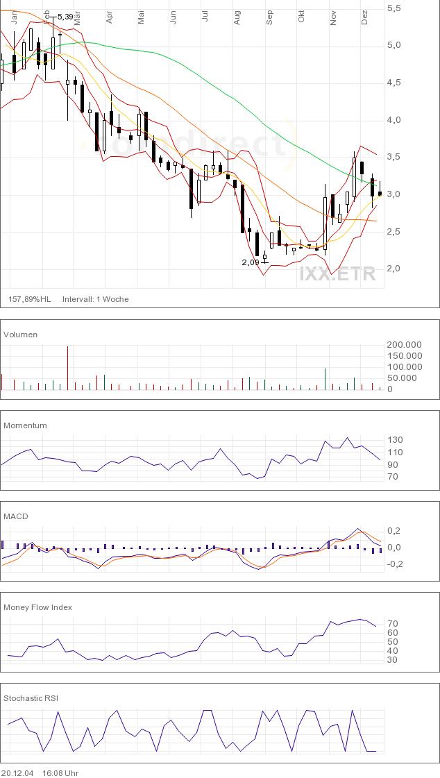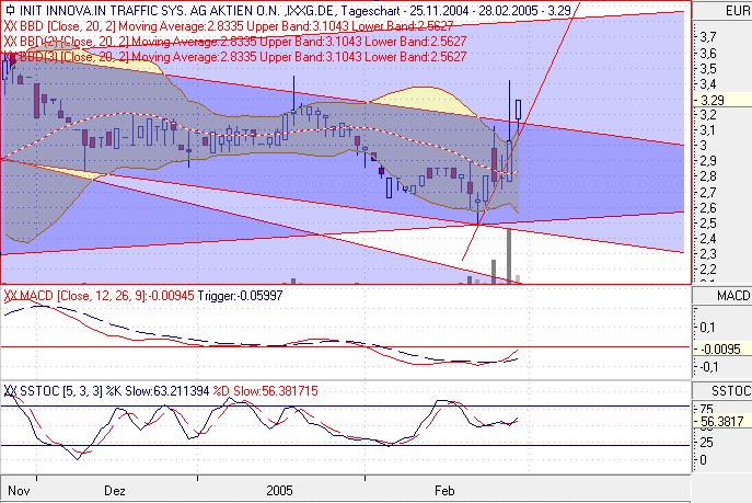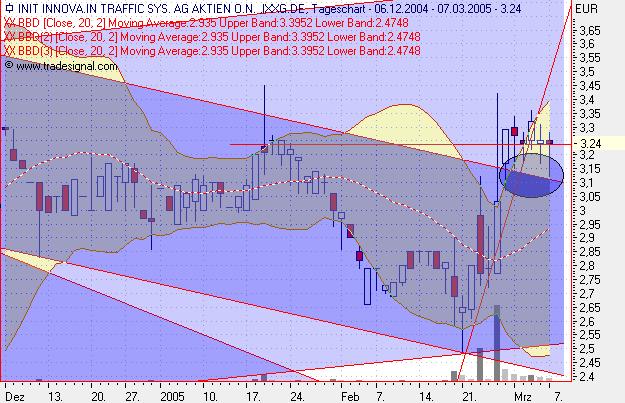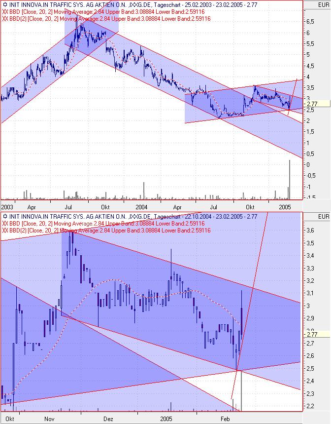 Und ich rate allen die Papiere zu halten. Init wird scheinbar gerne in Trends gehandelt und momentan sieht es nach einem kurzfristigen Up aus. Zahlen waren im Rahmen der Erwartungen, da wurde Kasse gemacht. Mal zur Entscheidungshilfe ein Langfristchart und und die Lupe daraus für die vergangenen Wochen. Für den Fall, daß der äußerst steile Aufwärtstrend sich nicht als Fake herausstellt, wäre ab ca. 3,15 Euro wieder Platz nach oben. In dem Bereich unbedingt auf das Volumen achten, wenn da abverkauft wird sollten ebenfaslls Gewinne realisiert werden. Absichern würde ich z.Zt. bei 2,50 Euro bzw. spätestens 2,40 Euro.