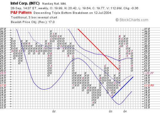 Das Weihnachtsquartal ist für Intel immer eines der besten - die saisonalen Jahrestiefs finden sich fast immer Anfang Oktober. Mancher Fondmanager wirft die Aktie bereits jetzt - zum Ende des Geschäftsjahrs am 30.9.04 - aus Steuergründen auf den Markt.