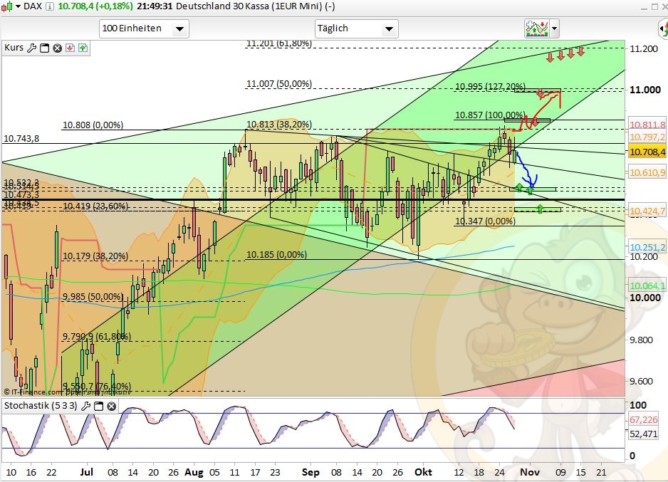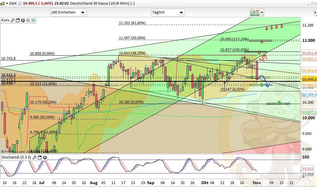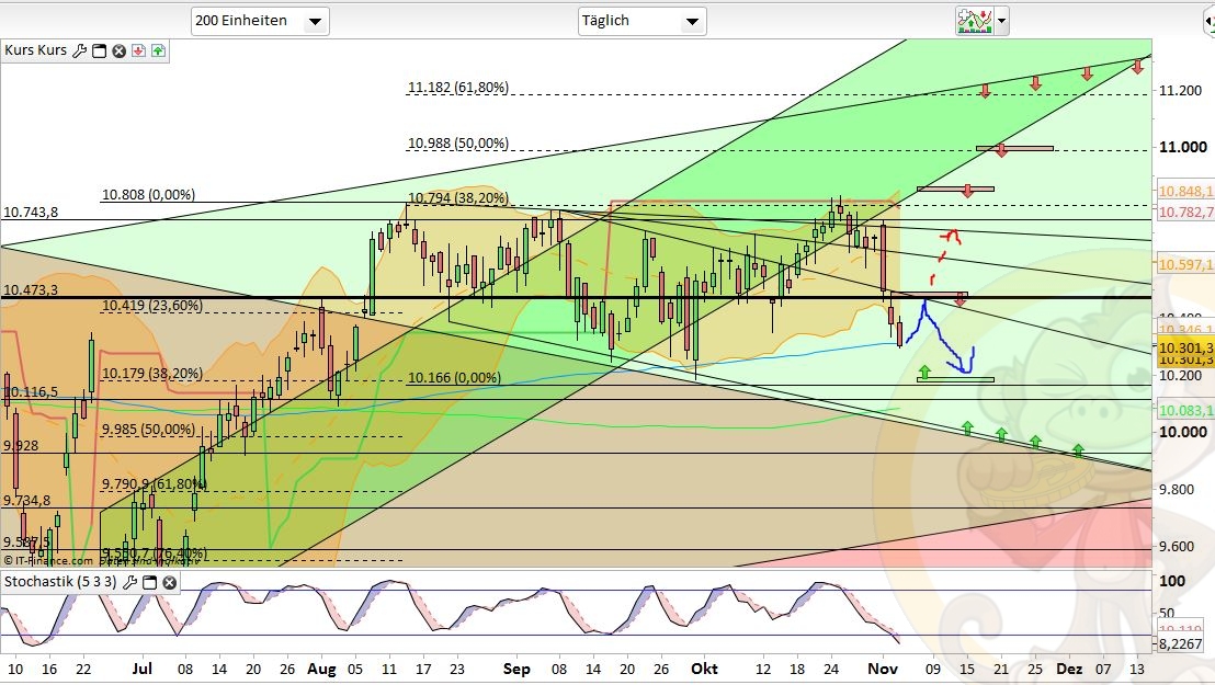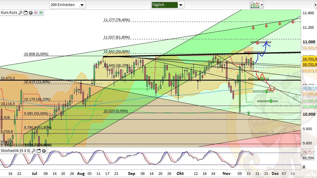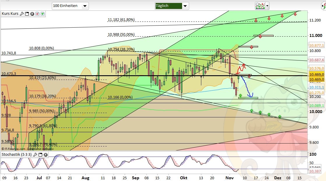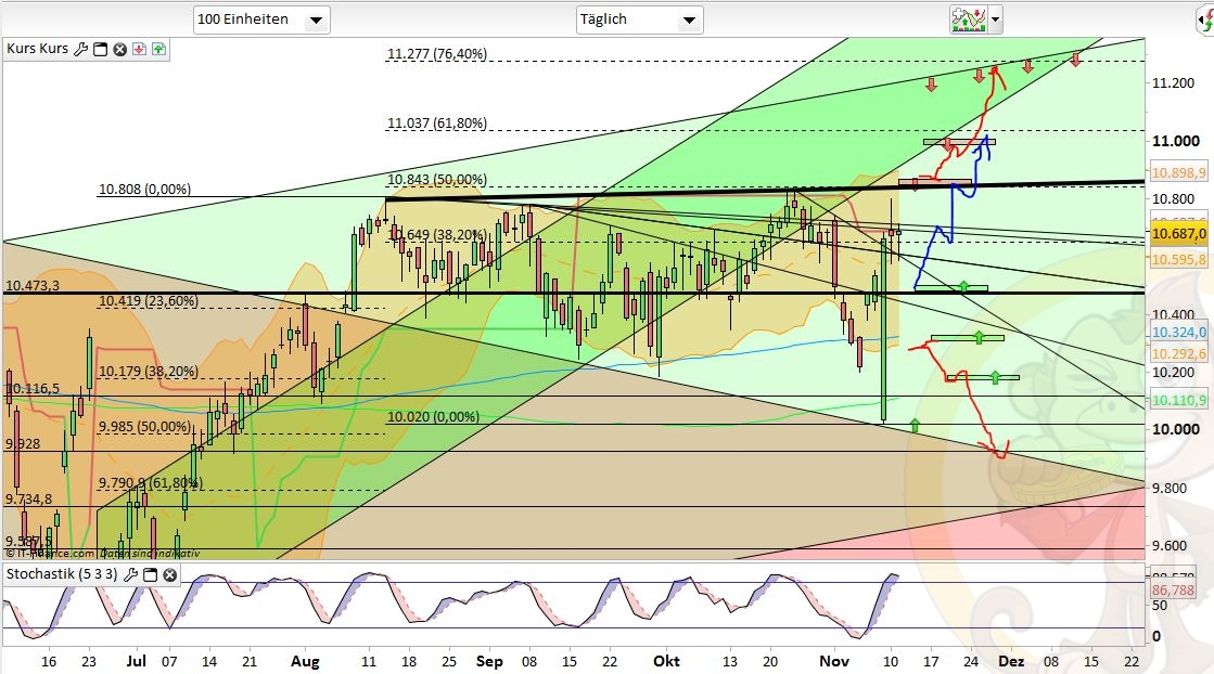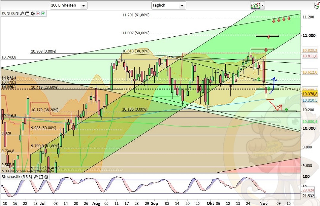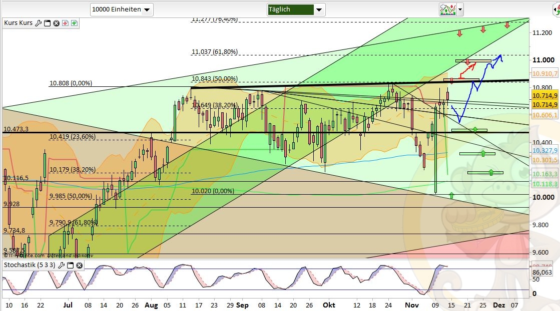 Das Fazit der Analyse vom Vortag war: „Ich rechne für Montag & Dienstag mit einer Fortsetzung der Konsolidierung bis 10550, 10420 oder gar 10330. Ab Wochenmitte könnte ich mir dann den Startschuss für die Jahresendrallye vorstellen bei der gut und gerne nochmal bis zu 10% Aufwärtspotential verwandelt werden könnten.“