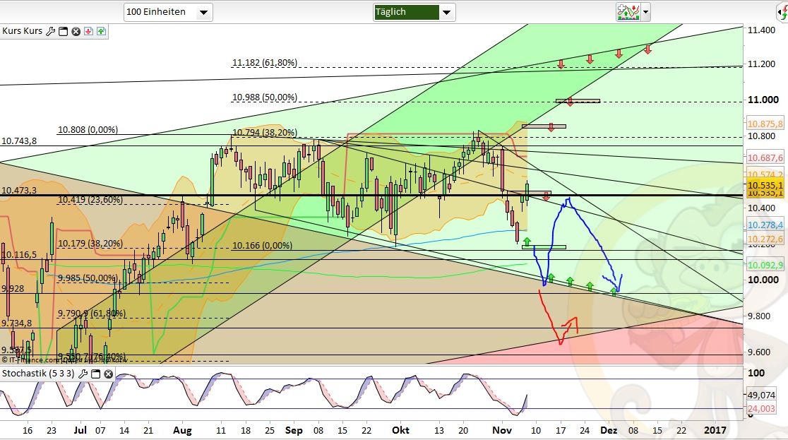 Der Markt signalisiert uns nun durch die doch längere Pause seit der 10800, dass er die Bewegung von 10020- 10800 als eine Bewegung anerkennt, somit muss die Korrektur seit 10800 auch nicht mehr nur auf Teilstrecken, sondern auf die Gesamtlänge angewendet werden. Wozu führt das nun? Das führt dazu, dass sich die Korrekturpotentiale von 10511/10450 auf 10507, 10420 und gar 10330 ausweiten. Dabei müssen die Bullen auch stets Druck aufrecht erhalten, da durch die deutlich unterschiedlichen Tiefs aus der US-Wahlnacht (Ovn 9965, FDax ~ 10020, Xetra 10174 -> Ja mein Lieblings-Gap auf 10170 ist noch offen!!) auch Unterstützungen für die Bullen schwerer greifbar werden. Das mag nun schlecht klingen, ist es aber nicht zwingend! Da sich die Korrektur nun auch auf die Gesamtstrecke des Trump-Fake-Gaps anwenden lässt, erhalten wir nach oben raus viel mehr Schmackes und Dax könnte unbeirrt noch einmal 800p vom Korrekturende hochrammeln. Nehmen wir an die Korrektur läuft nun bis Mitte der Woche nochmals auf 10420 zurück, so könnte Dax von da aus die 800p Potential prima nutzen um meine obere Flaggenkante im Tageschart bei 11220 anzulaufen.