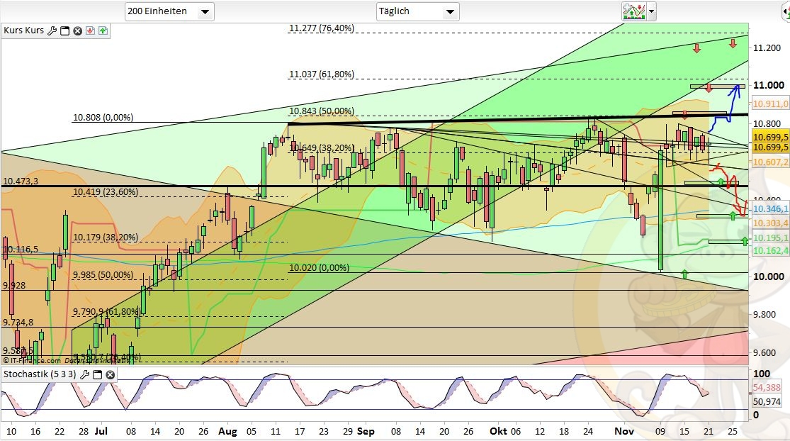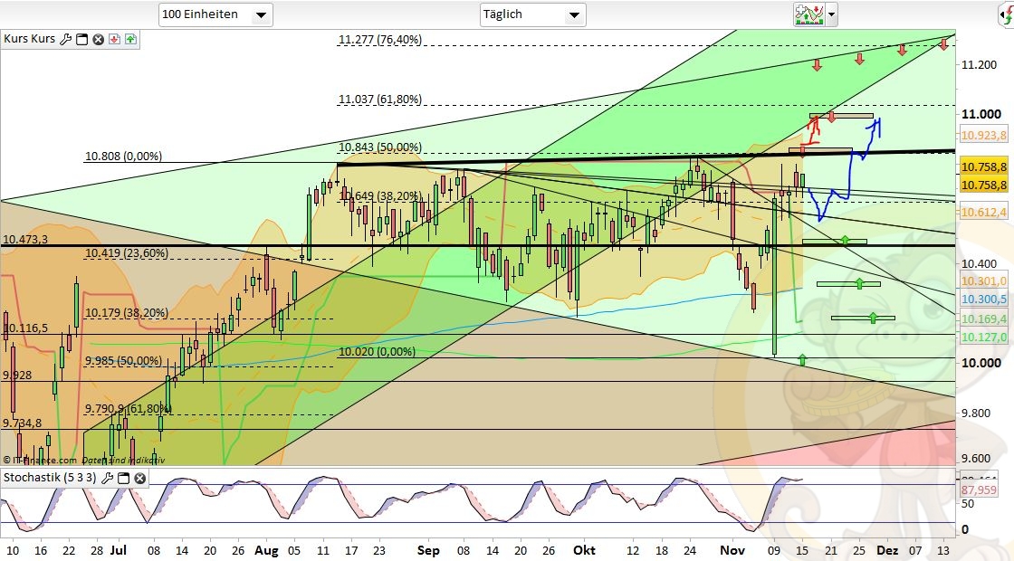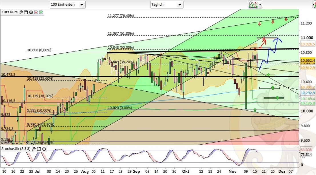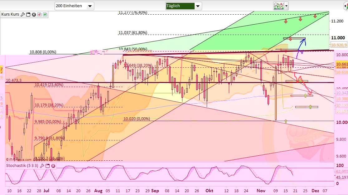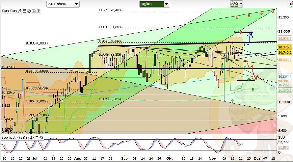 Das Fazit der Analyse vom Vortag war: „Es wird weiterhin mit einem Überschreiten von 10800 gerechnet. Vorherige Tiefs auf 10600/10560 würden das ganze nach oben hin nachhaltiger werden lassen.“, das Tief auf 10600 haben wir nun gesehen und dabei sogar bis 10591 gepeakt. Somit könnte das Seitwärtsmuster seit 10.11. (10801) ein mögliches Finish generiert haben. Mit dementsprechender Dynamik ging es dann auch im Anschluss nach oben. Somit lässt sich festhalten, dass die Bullen nach wie vor bereit sind günstig in den Markt nachzukaufen und hier die charttechnischen Vorlagen begierig aufgreifen. Der Mut über die 10800 hinauszuschreiten fehlt hingegen weiterhin.