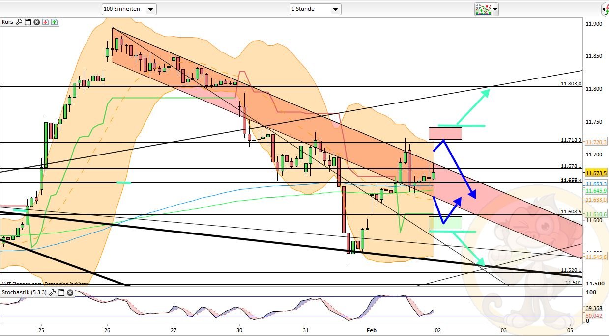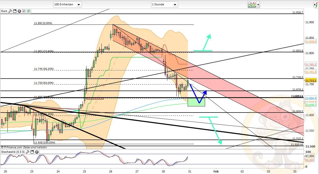 Die Sache ist nur die, dass Gott und die Welt den Dax zum Freitag nun fallen sehen will. Egal ob Bulle oder Bär, mit wem man sich auch immer unterhält, erwarten alle die Trendforsetzung nach unten, bevor die Bullen dann ihre nächste Aufwärtsbewegung dort unten beginnen sehen und die Bären die Fortsetzung der Reise gen 11000. Wie soll denn da was fallen? Nun steckt der Dax zwar rein nach der Theorie in einem bearishen Erholungs- bzw. Korrekturmuster, hat aber von etwas weiter draußen betrachtet seinen Abwärtstrend seit 11895 verlassen. Und zwar nicht nach unten, um eine Trendbeschleunigung auszulösen, sondern nach oben. Somit sollte man zum Freitag nun unglaublich aufpassen, was der Kerl hier fabriziert und eher versuchen ihm zu folgen, als sich ihm in den Weg zustellen. Longtrigger ist und bleibt die 11675. Über ihr aktivieren wir uns das Erreichen von 11800. Aufgrund meiner Prognose zum Montag nehme ich dennoch die nun ausstehende Abwärtsbewegung in den Chart, als favorisierte Route. Ich werde allerdings selbst keine Positionierung auf diesem Niveau eingehen und mir das Ganze bis Mittag erst einmal anschauen, da ich in diese 50/50 Situation hier Stand 11650 nicht reingreifen mag. Wo Risiko drauf steht, ist meistens auch welches drin.
