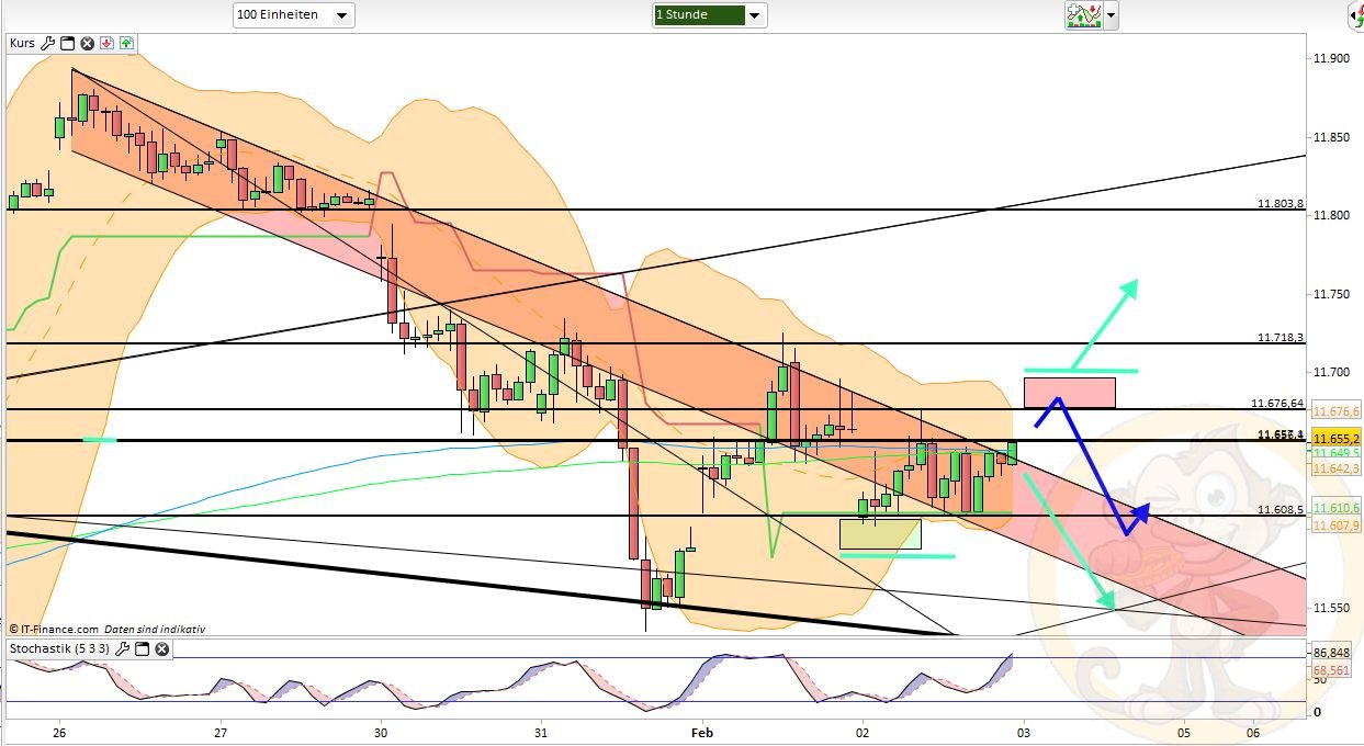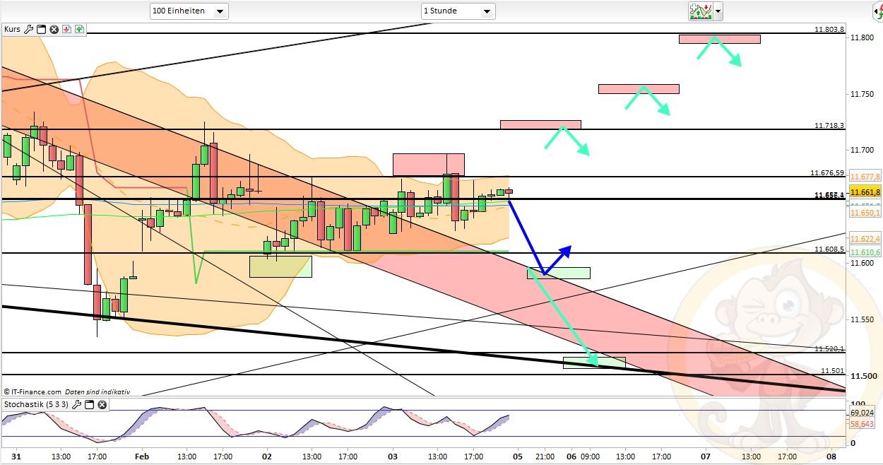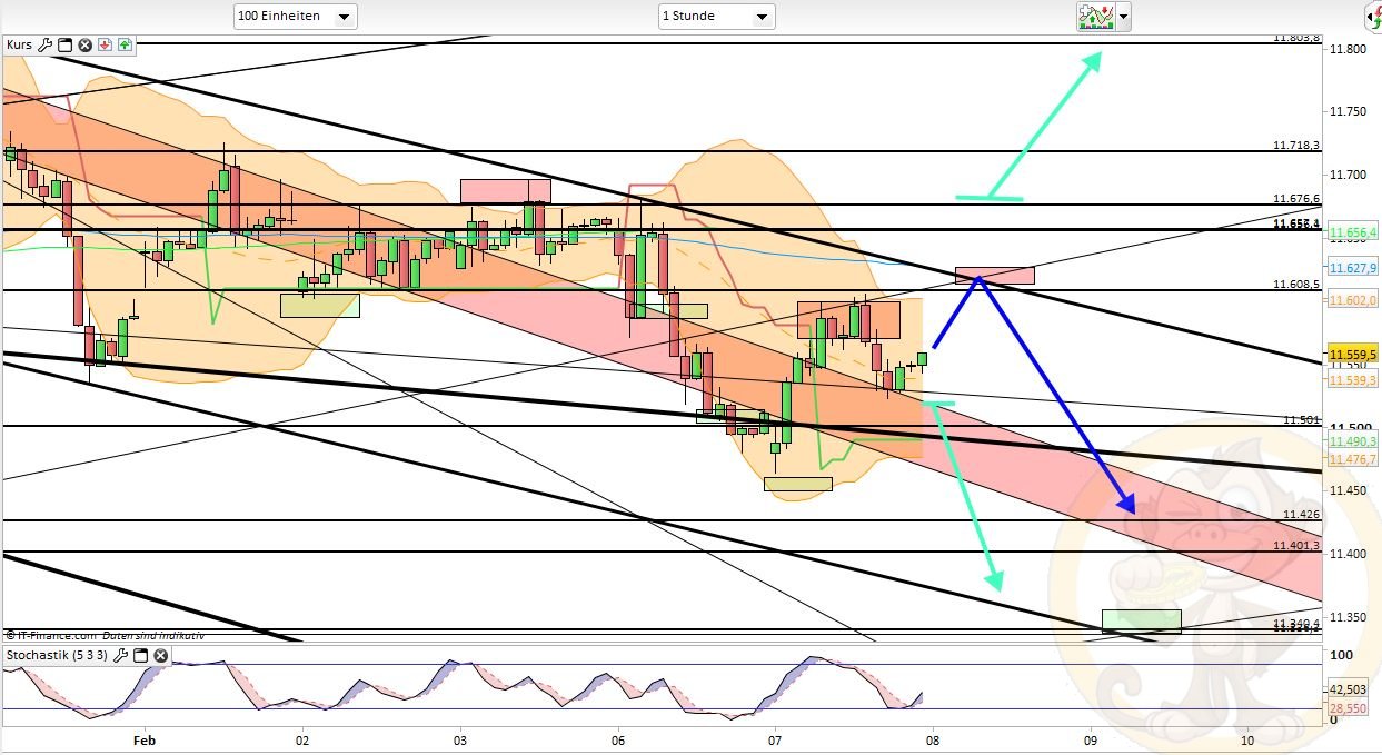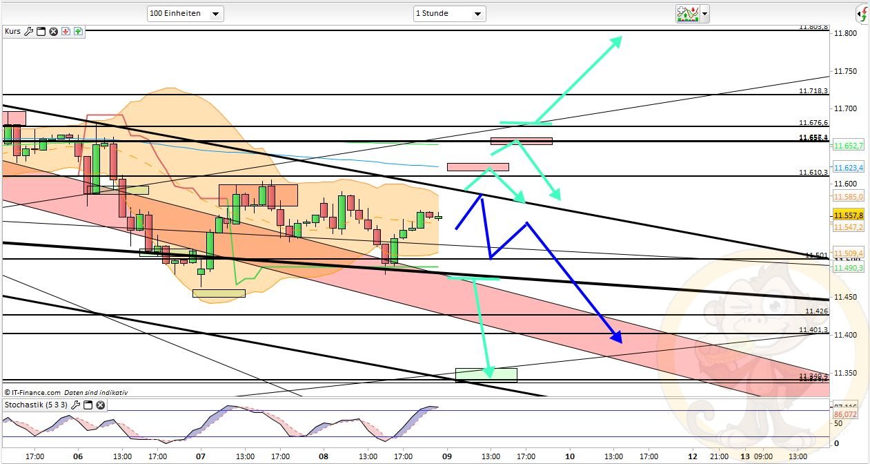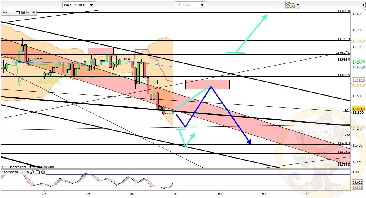 Ich hatte bereits zum Montag präferiert, dass wir an der 11460 noch einmal hoch drehen, um dann Donnerstag oder spätestens Freitag das noch bearishe Bild zu verwandeln. Daher liegt nun viel Verantwortung auf dem Freitag. Mein LongTrigger bei 11675 ist weiterhin unangetastet und „noch“ handelt es sich bei der ganzen Maskerade „nur“ um eine Erholung der vorherigen Abwärtsbewegung. Da bedarf es auch keiner großen analytischen Fähigkeiten, eine flache Erholung der Abwärtsbewegung den Bären zu zusprechen, da aus der Charttechnik heraus, darauf weitere Tiefs folgen sollten. Löst sich diese bearish einzuordnende Erholung also nach unten auf, dürften wir schnell bis an die 11426 springen und im besten Falle die 11400 mit einem glatten Durchschuss unternageln, um uns bis 11340 vor zu wühlen.