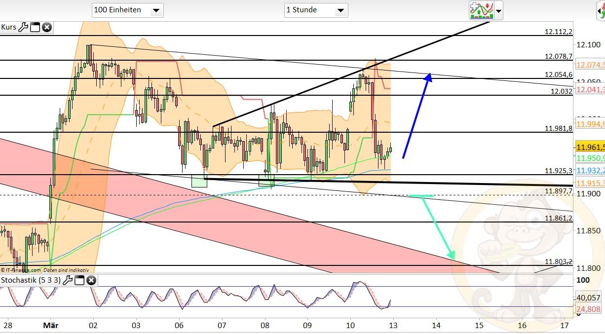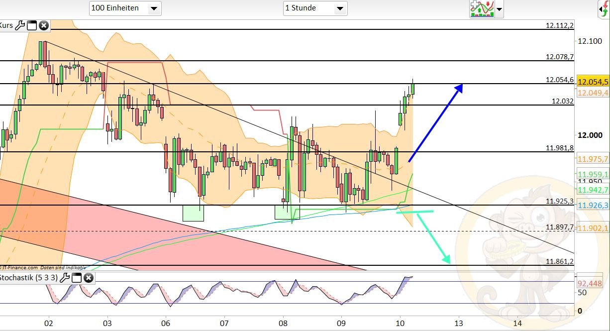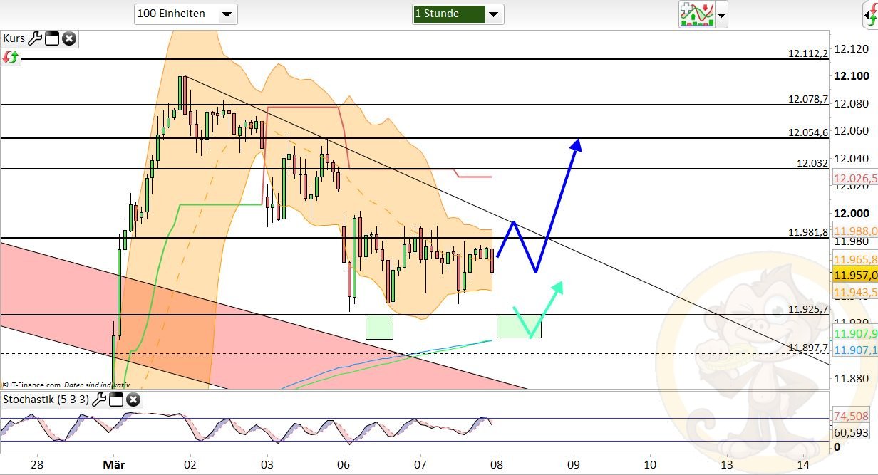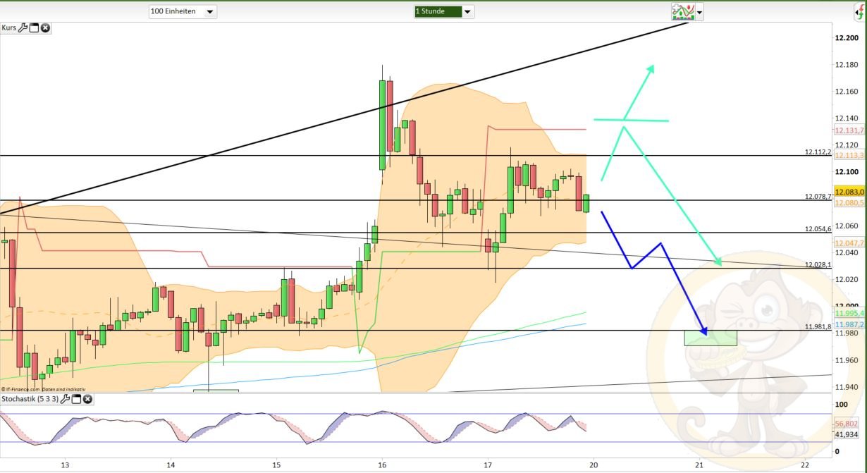 Der Verfall ist durch, daher gilt es nun, sich neu zu ordnen. Dies kann auch mal wieder etwas mehr Bewegung in den Markt bringen, der sich schon verhältnismäßig stark zurück hielt in der vergangenen Woche. Der Longtrigger für den Montag muss nun aber von der 12112 weichen und wandert auf 12138. Erst wenn diese nun per Stundenclose überwunden werden kann, ist mit einem Erreichen der nächsten übergeordneten Zone bei 12220/12231 zu rechnen. Da das momentan nicht favorisiert wird, kann man unterhalb von 12138 somit von einem Erreichen von 11980 ausgehen.