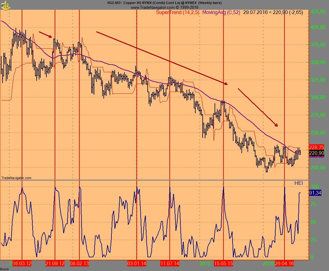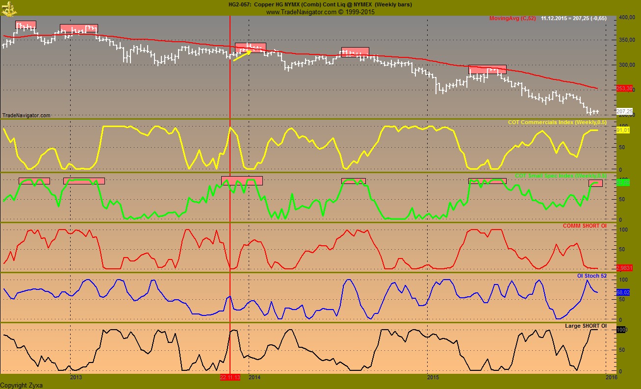 Kupfer ist jetzt grad so eine Sache.... Zur Erklaerung der Indikatoren Cot Commercial Index (blau) zeigt die Long Posi minus der Short Posi der Commercials, also die Netto Anzahl....ist sie nahe 100, haben wir netto auserst bullische Commercials und wir sollten kaufen wenn dieser Wert aubfaellt......ich war bei dem Miniastieg nicht dabei, weil dieser wert nicht 100 erreicht hat....UND wir immer noch einen fallenden Trend haben......wir sollten immer nur in Trendrichtung traden.
