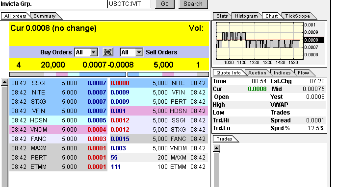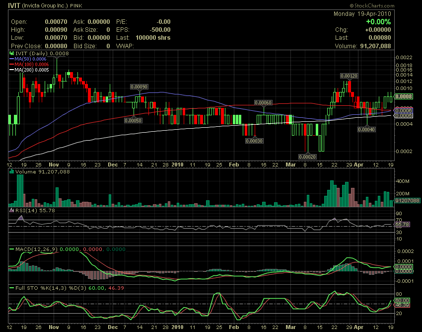 NEWPORT BEACH, Calif., April 19, 2010 (GLOBE NEWSWIRE) -- BUYINS.NET, http://www.buyins.net, a leading provider of Regulation SHO compliance monitoring, short sale trading statistics and market integrity surveillance, has updated coverage on Invicta Group (Pink Sheets:IVIT - News) after releasing the latest short sale data through April 16, 2010. The total aggregate number of shares shorted since August 2009 is approximately 5.23 billion shares. The SqueezeTrigger price for all shares shorted is $0.0007. A short squeeze has begun as shares of (Pink Sheets:IVIT - News) closed at $.0008, above the primarly SqueezeTrigger Price of $.0007.