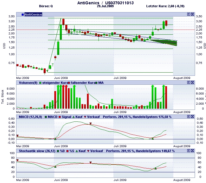 eine horizontale Unterstützung und zugleich ein Fibonacci-Retracement. Das wäre jetzt kein guter Punkt um zu verkaufen (wenn man sie schon hat, wie ich leider, der ich mich von dem letzten Scheinausbruch habe zum Narren halten lassen...). So eine 2,25 wäre dann gar kein Beinbruch und könnte wieder hochziehen. Mal schauen. Falls sie unter 2 geht, wäre aber wohl ein Seitwärtstrend entstanden. Einen Rückgang bis auf 1,60, das Niveau des vorherigen Kanals, kann ich mir irgendwie nicht vorstellen, würde aber in jedem Fall dann dauerhaft abwärts weisen. Meine zehn Cent, wie ichs mir vorstelle... (Bitte beachten, der Chart reicht bis zum gestrigen Schlusskurs) ----------- * * *