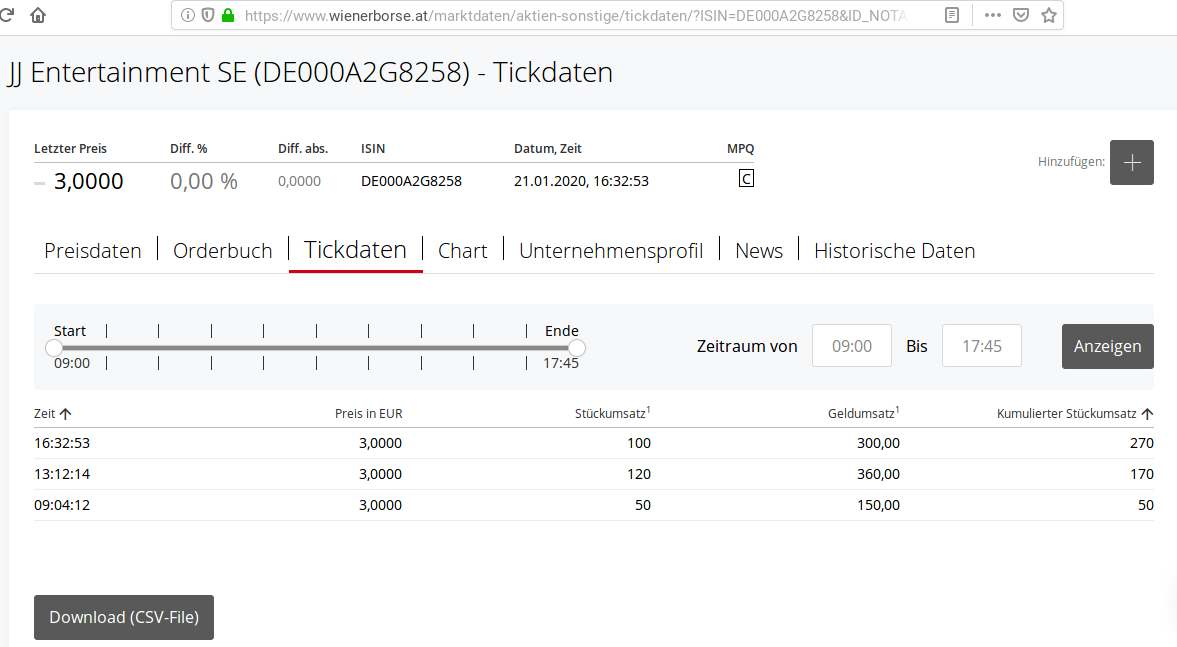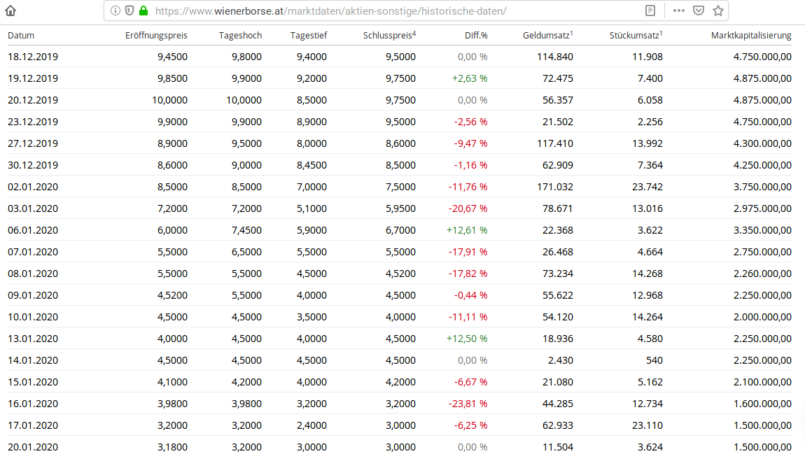 Besten Dank für deine Beiträge. Auch wenn ich nicht immer alles verstehe. :) es sollte seit längerem eine externe Bewertung da sein, hat sich aber verzögert... wid so einiges. Was mir auffällt, sind die Häppchen-Käufe/Verkäufe an der Börse Wien dieser Aktie. Will man 1000 verkaufen, verkauft man 20, dann 110, dann 200 usw. ja genau, jedesmal horrende Gebühren (40€). Ich empfinde das al riessiges Handicap (u.a.). Nun, es ist ein Jungunternehmen. Die Inhaber haben ja so einiges an eigenen Aktie. Wie ihnen der Zerfall auf noch 0.50€ zusetzt und wie es sich weiterentwickelt? Keine Ahnung. Von Insolvenz bis zu Höhenflug alles möglich? Wie viele verschiedene Aktienbesitzer gibt es denn? |