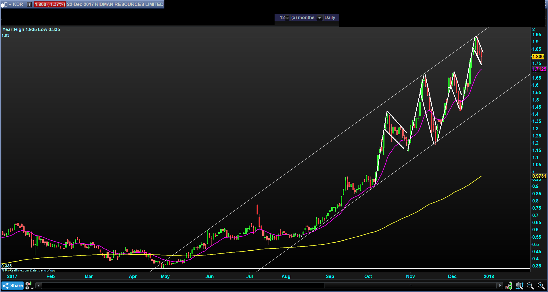 Schau dir den Chart an, da siehst du die obere und untere Begrenzung des Aufwärtstrend.. Es kann also durchaus nochmal auf 1,65 AUD gehen, unabhängig von guten oder schlechten Neuigkeiten.. Es gibt Institutionen und Leerverkäufer die drücken an volumenschwachen Tagen den Preis und drängen damit Privatanleger die die Nerven zum Verkauf, dann kaufen sie selber wieder billiger ein, weil sie wissen das hier noch großes Potential herrscht.