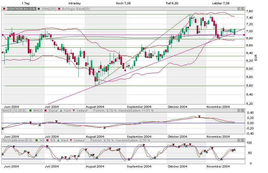 Während heute (und bereits am Freitag abend) der gesamte Markt erst mal in Richtung Keller unterwegs war, macht die Aktie von Kontron das was schon die letzten Tage angesagt war: sie pendelt, zuverläaggig wie eine Uhr. Da das Volumen ziemlich konstant bleibt, tendiere ich hier zu einer positiven Prognose. Der Anstieg seit August ist wohl abgeschlossen, vielleicht bringen die nächsten Tage den ersehnten Kursanstieg. Der könnte dann auch ziemlich linear in den Bereich bis 8,50 Euro laufen, da der Widerstand bei ca. 7,45 Euro aufgrund der stattgefundenen Konsolidierung kaum noch Wirksamkeit aufweisen dürfte. Da bleibe ich auf jeden Fall drin.