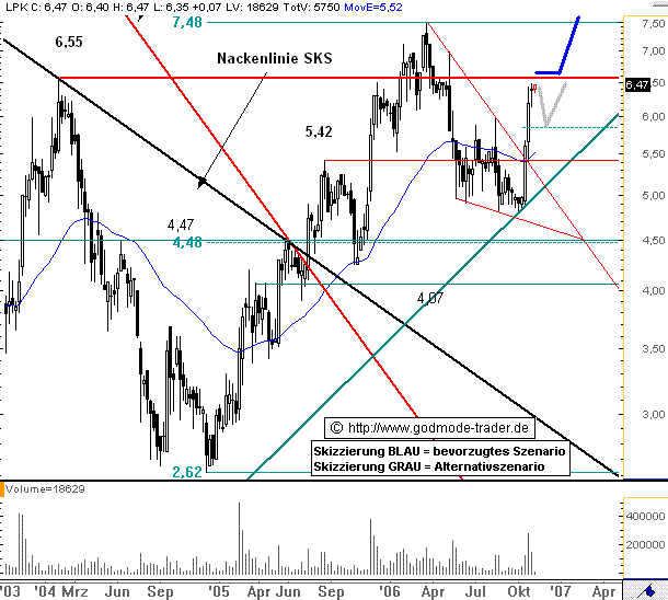 Krasses Missverhältnis. Im März erreichte der Kurs 7,40 €.Dann stürzte er mit dem Markt ab und erholte sich nicht mehr.Aktuell notiert das Papier bei 5 €,auf Basis der Gewinnschätzungen für 2007 liegt das KGV unter 10." Gemessen am Umsatz und Ergebnisswachstum,passt diese Bewertung vorne und hinten nicht",sagt Analyst Ansgar Rauch von der NordLB.Angemessen sei ein KGV von 14 oder 15.Für den Göttinger Laserkonzern Linos,dessen Margen weit unter LPKF-Niveau liegen,zahlte die Private-Equity -Gesellschaft Candover den 16fachen Gewinn. Neue Produkte könnten wieder Phantasie entfachen und davon hat LPKF gleich mehrere.Ein noch vielseitiger einsetzbarer Stencil.Laser,der mikroskopisch kleine Löcher in Druckschablonen schneidet,"kommt sehr gut an",berichtet Vorstand Bernd Lange.Die Markteinführung gelang im 3 Quartal. Bei Stencils ist LPKF Weltmarktführer,doch die Kunden benötigen selten größere Stückzahlen.Das gilt auch für die Leiterplatten Plotter,beliebt bei Entwicklern.Deshalb nehmen die Niedersachsen nun Massenmärkte ins Visier.Seit Handy-Antennen nicht mehr auf,sondern in den Telefongehäusen stecken,bestehen sie aus gestanzten Blechformteilen,die für jede Baureihe neu konzipiert werden."Manchmal ändert schon eine andere Gehäusefarbe die Empangseigenschaften",erklärt Lange.Ersetzt man das Blech durch Kunststoffformteile,kann ein neues LPKF-Gerät darauf Leiterbahnen schreiben.Danach wird das Stück mit Metall beschichtet.Das Ergebniss sind empfangsstarke Antennen,die der Laser in Sekunden an jedes beliebige Modell anpassen kann." Wenn sich das Verfahren bewährt,wird das eine Lawine",prophezeit Lange. Die ersten Geräte sind im Einsatz.