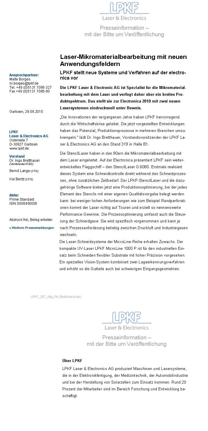 Den größten Anteil am Wachstum im ersten Halbjahr 2010 verzeichnete das Segment Schneid- und Strukturierungslaser mit einem Anstieg von 142 % im Vergleich zum Vorjahreszeitraum, vor allem aufgrund des starken Geschäfts mit Systemen zur Laser-Direkt-Strukturierung (LDS). Die bislang ausgelieferten Systeme haben sich im Produktionseinsatz bewährt. Bei der Herstellung von Mobilfunkantennen für Smartphones hat die LDS-Technologie mittlerweile eine führende Position eingenommen. Auch für die Herstellung von Laptop-Antennen und Sensorikbauteilen im Auto wird das LDS-Verfahren verstärkt nachgefragt. Anfang Juni hat LPKF den Erhalt eines Großauftrags von knapp € 6 Mio. für Lasersysteme zum Trennen von Leiterplatten gemeldet. Der Bereich Lasernutzentrennen eröffnet den Leiterplattenproduzenten neue Möglichkeiten und wird im LPKF-Konzern als Geschäftsbereich mit großem Wachstumspotenzial gesehen.