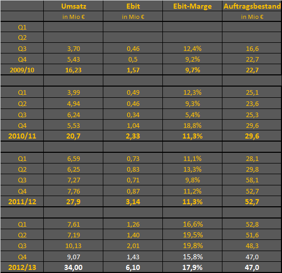 immerhin von 11% auf 19,5% gegenüber Vorjahr gesteigert, zustande gekommen ist, ist deine Argumentation doch echt müßig. Du kannst doch nicht ernsthaft ohne weitere Infos davon ausgehen, dass die Marge von 19-20% jetzt so hoch bleibt, und zwar selbst bei niedrigeren Umsätzen. Wir kennen die aktuelle Kostenstruktur genauso wenig wie den Umsatzmix in Q2 und Q3. Was den Auftragseingang angeht, muss man das ebenfalls in Relation zu dem verdoppelten Auftragsbestand (von 29 Mio auf 58 Mio innerhalb eines Quartals) im letzten Jahr setzen. Ist doch logisch, dass der AB derzeit scheibschenweise fällt, weil dieser Großauftrag jetzt abgearbeitet wird. Der Auftragseingang ist aber durchaus okay derzeit. Aber sicherlich sollte in den kommenden 2-3 Quartalen mal wieder ein Großauftrag kommen, der das neuerliche Wachstum ermöglicht.