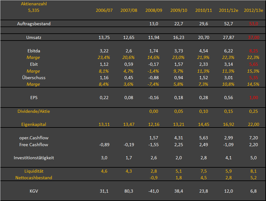Yepp, kann man sich eigentlich leicht ausrechnen, auf was das (auch beim Ebit) hinausläuft. Vorletztes Jahr gabs noch 2,2 Mio Abschreibungen, letztes Jahr gabs 3,1 Mio Abschreibungen. Der Unterschied entspricht ja fast diesen 0,82 Mio €. Die Marge wird vermutlich nicht nur durch diese Ersparnis sondern auch durch andere Skaleneffekte deutlich steigen. Aber ich warte erstmal die Q2-Zahlen im Mai ab, um da eine genauere Analyse zu machen. Würde mich aber nicht wundern, wenn die Ebit-Marge von 11,3% in 2011/12 auf 14% in 2012/13 steigt. Ist vielleicht sogar zu konservativ, falls der Umsatz noch höher ausfällt als von mir bisher unterstellt. Man muss sich ja nur mal die Ebitda-Marge anschau. Wenn die trotz deutlichem Umsatzanstieg nur gleich bleibt, also keine Skaleneffekte auftreten, würde das Ebitda in diesem Geschäftsjahr schon bei 8,2-8,5 Mio € liegen. Rechnen wir mal mit 2,2-2,5 Mio € Abschreibungen, dann hätten wir ein Ebit von rund 6 Mio €, was einem Anstieg von 90% entspräche. Daran sieht man wie extrem hier die Effekte dieses Jahr auf das EPS wirken könnten. Nicht ganz ausgeschlossen, dass das EPS auf 1,0 € steigt. Ic glaub das hat bisher noch niemand auf der Rechnung. Der Konsens liegt vermutlich irgendwo bei 0,75 €. |